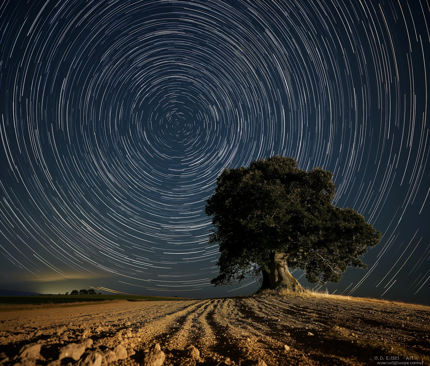 Stunning star trails swirl above a lone tree on a textured landscape, capturing the Earth's rotation in a serene night scene.