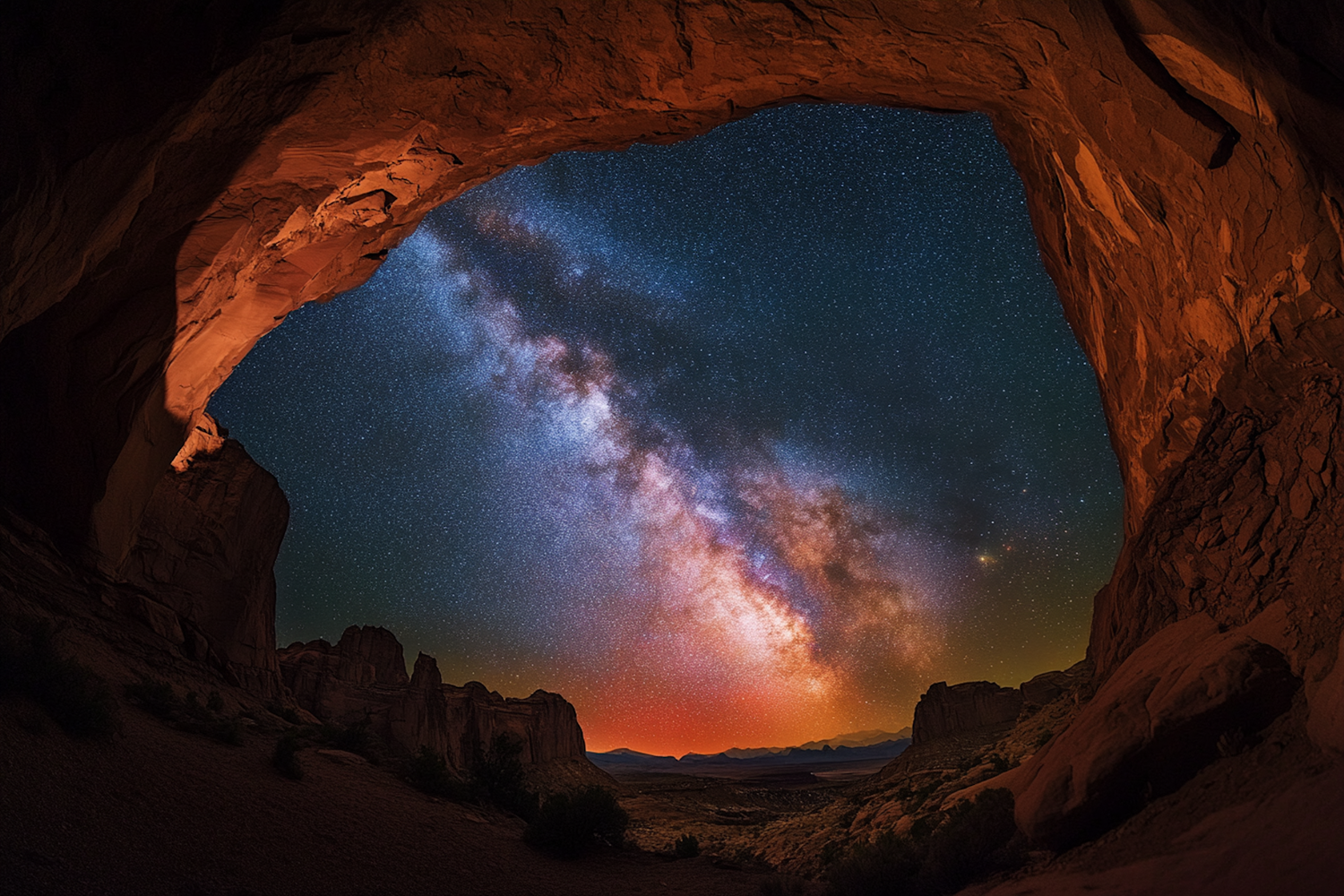 Stunning Milky Way view framed by a natural rock arch, with vibrant stars and a glowing horizon. Perfect blend of night sky and geology.