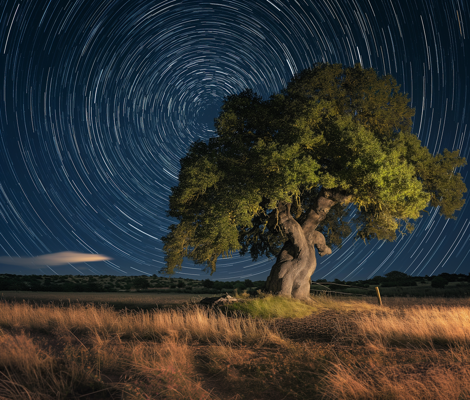 Majestic tree under swirling star trails in a serene night landscape, with golden grass and a distant cloud adding depth.