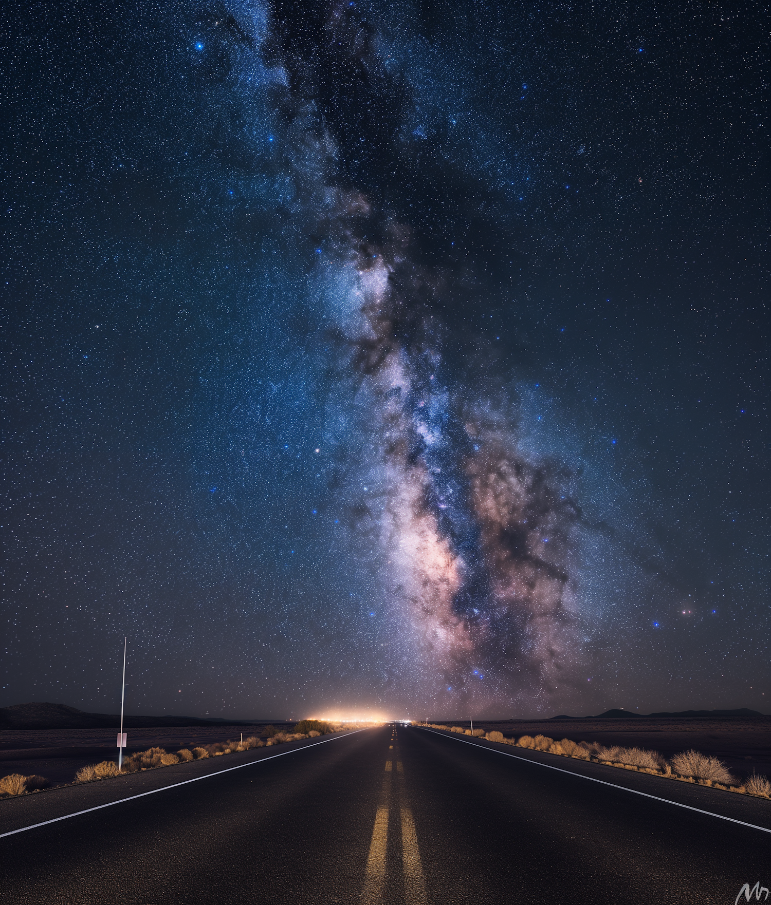 Stunning night sky with the Milky Way over a deserted road, capturing the vastness of the universe and the solitude of the open road.