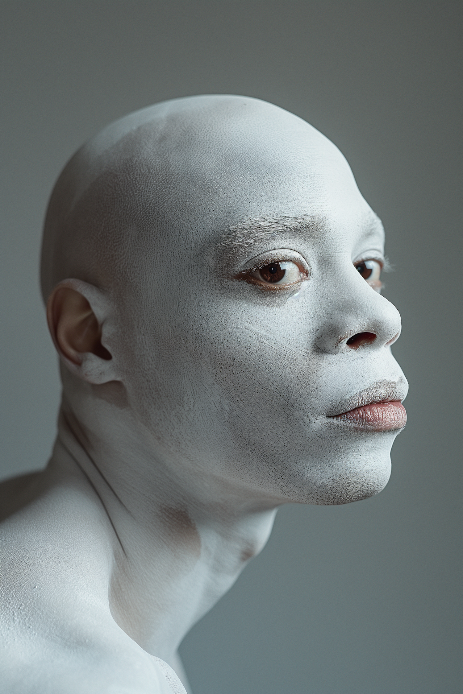 Close-up portrait of a person with white-painted skin and brown eyes, set against a muted gray background.