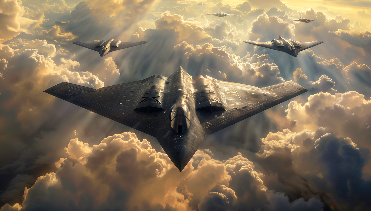 Futuristic stealth bombers soar through golden clouds, reflecting sunlight. A dramatic scene of power and technological advancement.