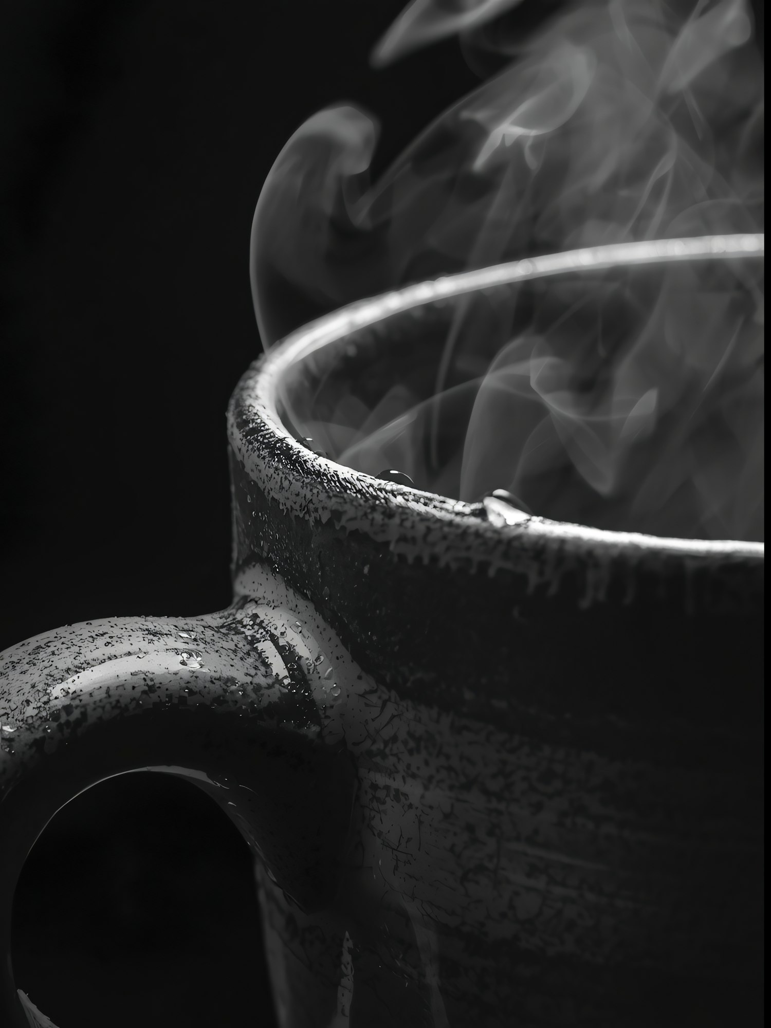 A black-and-white close-up of a steaming ceramic mug, showcasing its textured surface and swirling steam against a dark background.