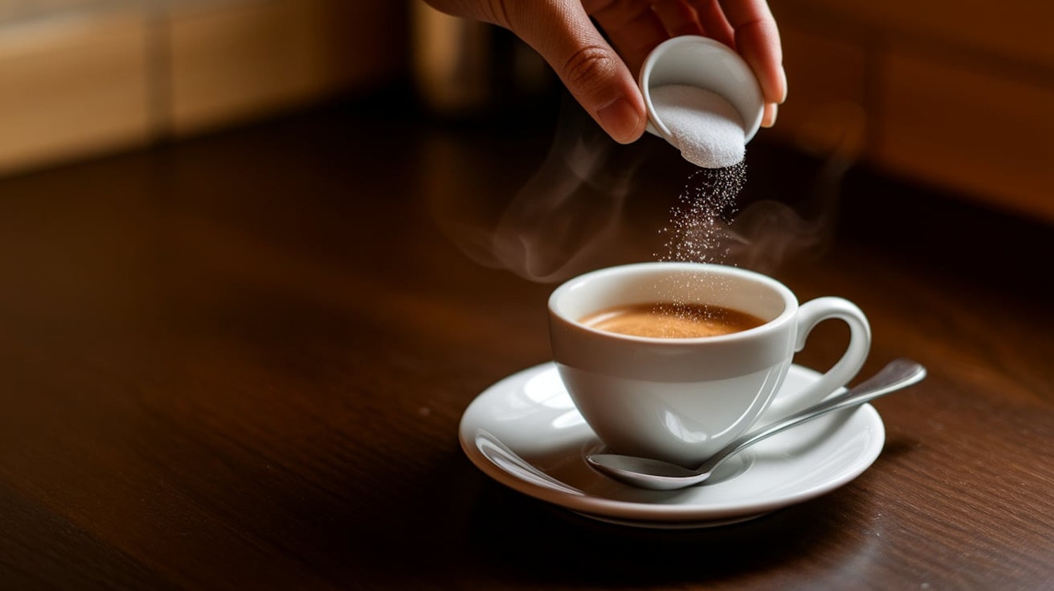 Steaming coffee in a white cup with sugar being sprinkled, set on a wooden table with a silver spoon. Warm and inviting morning vibes.