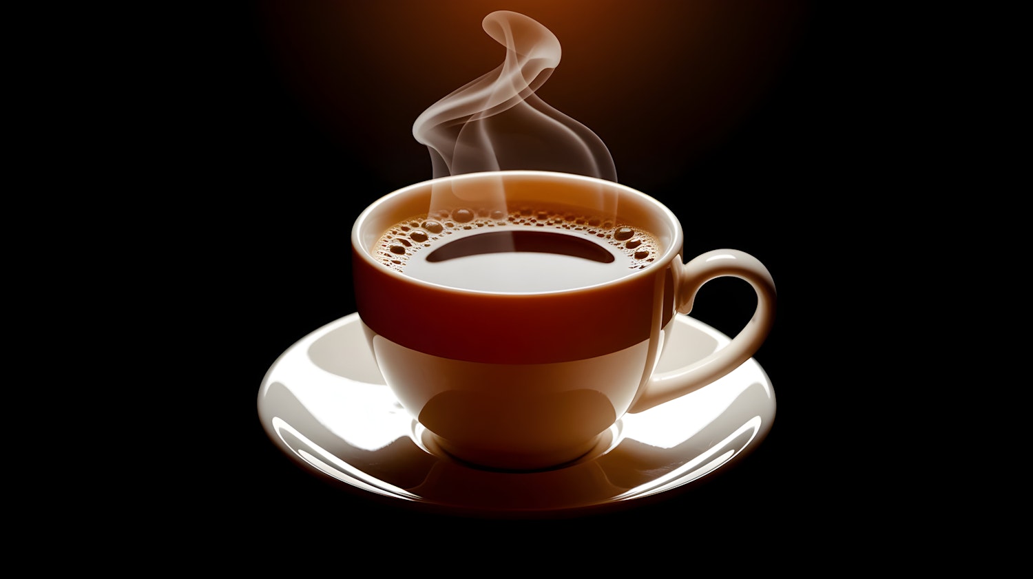 A steaming cup of coffee on a white saucer with a brown band, set against a black background. Perfect for coffee lovers!
