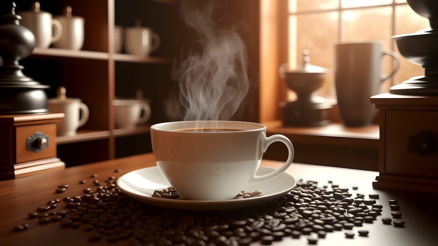 Steaming coffee cup on a wooden table with scattered beans, warm sunlight, and cozy shelves of mugs and grinders in the background.