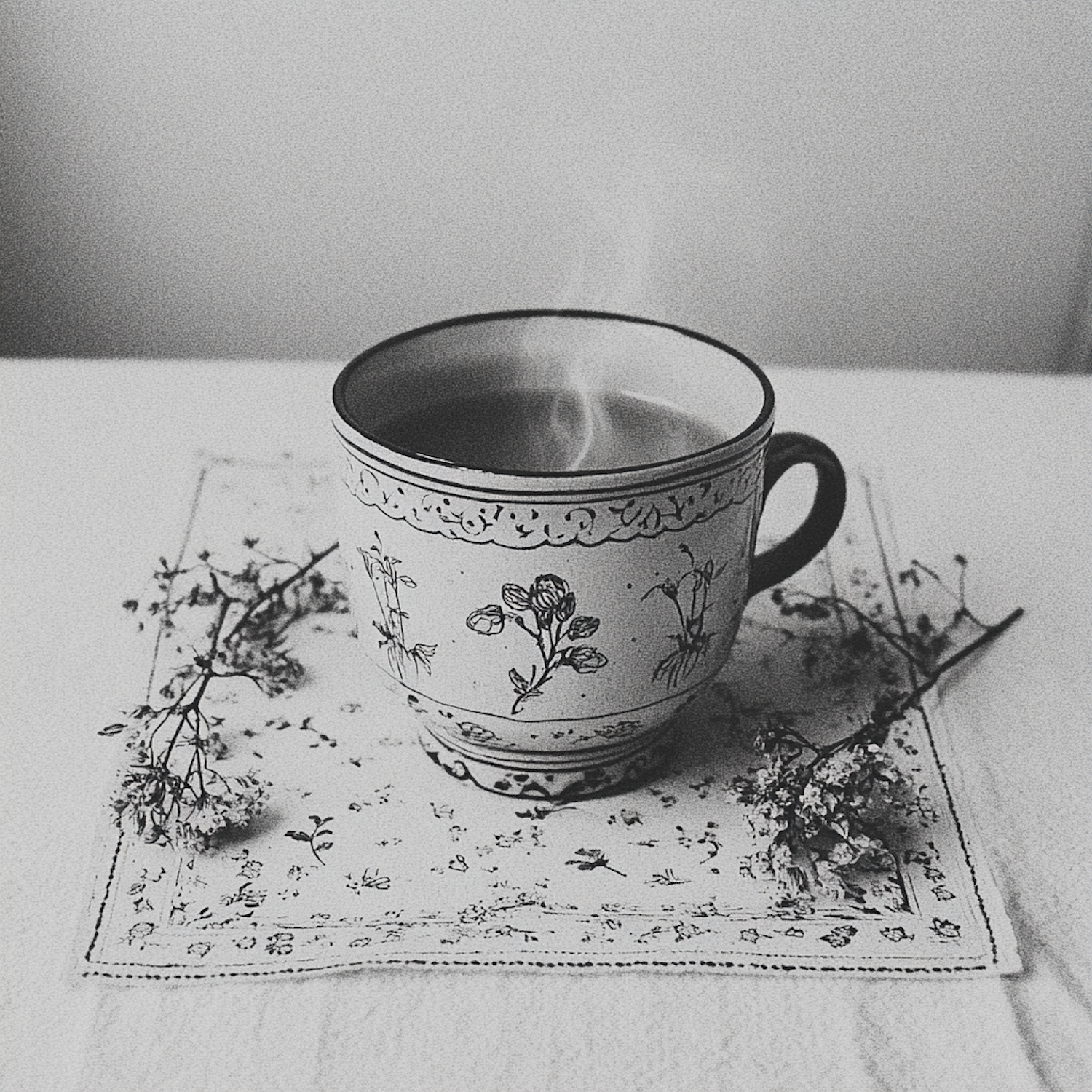 A steaming floral-patterned tea cup on a delicate cloth with dried flowers, captured in a calming black-and-white aesthetic.