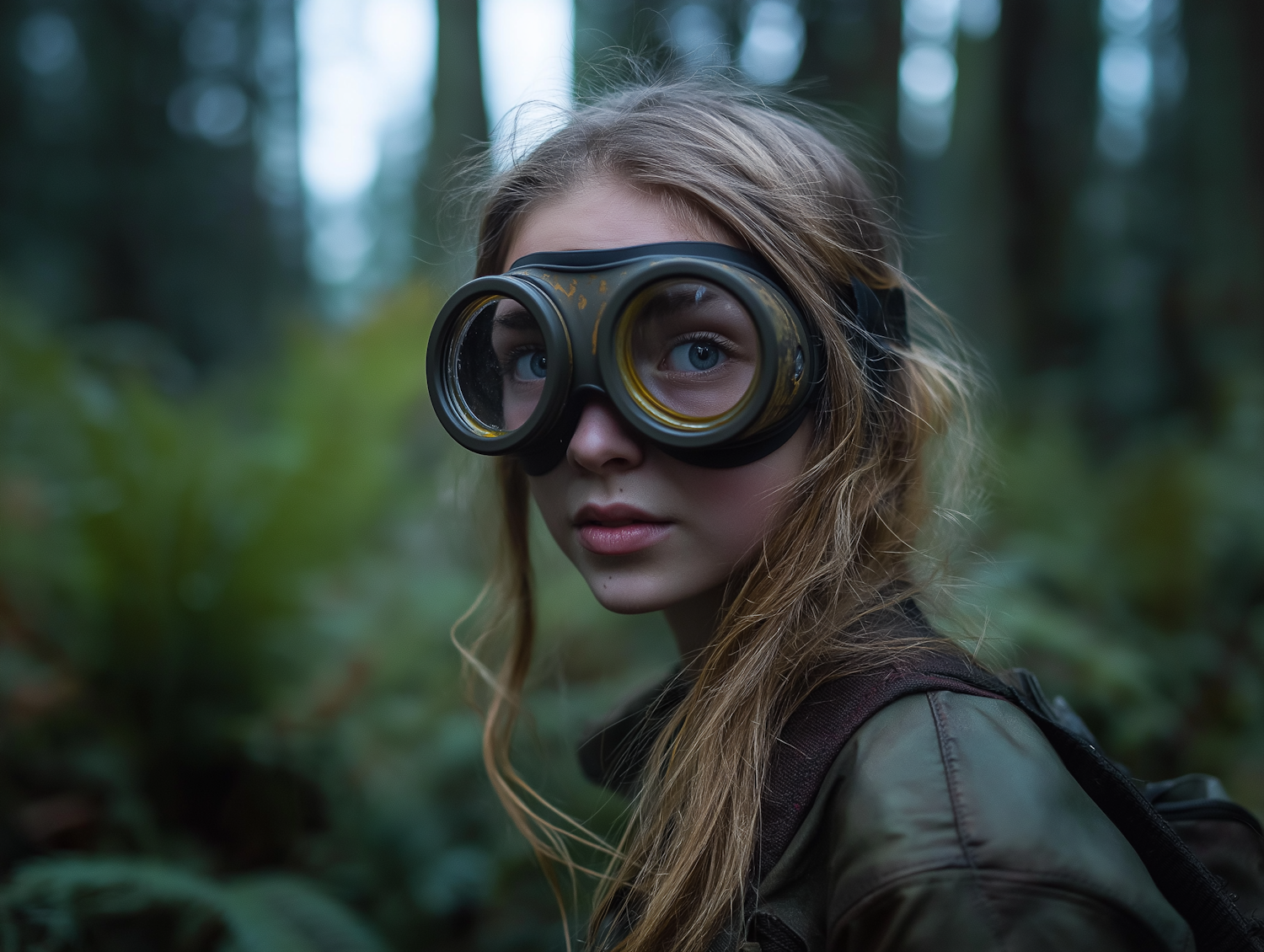 Young girl with goggles in a lush forest, exuding curiosity and adventure. Her blue eyes and blonde hair stand out against the green backdrop.