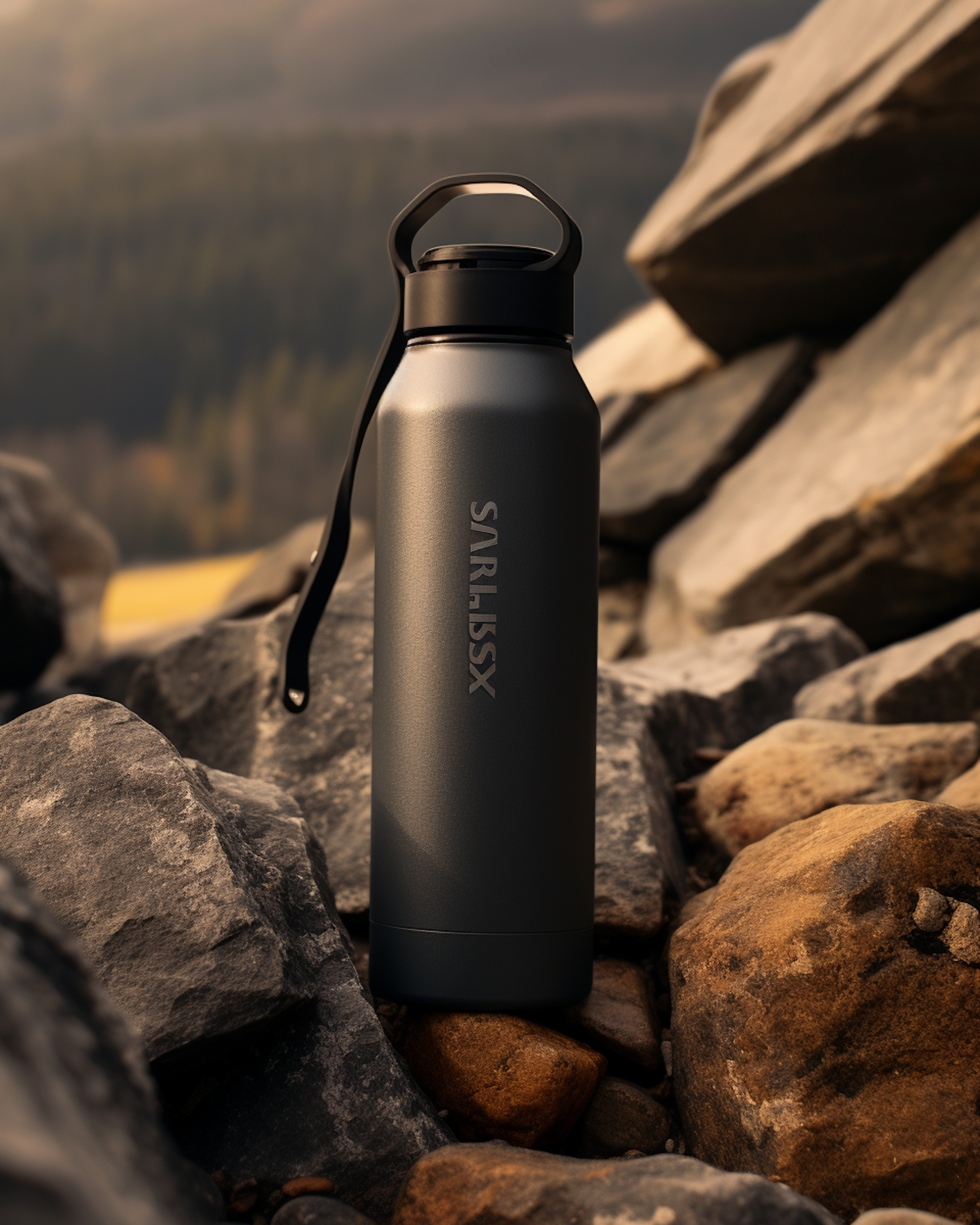 Sleek matte black water bottle with handle, nestled among rugged rocks, set against a blurred forest and mountain backdrop.
