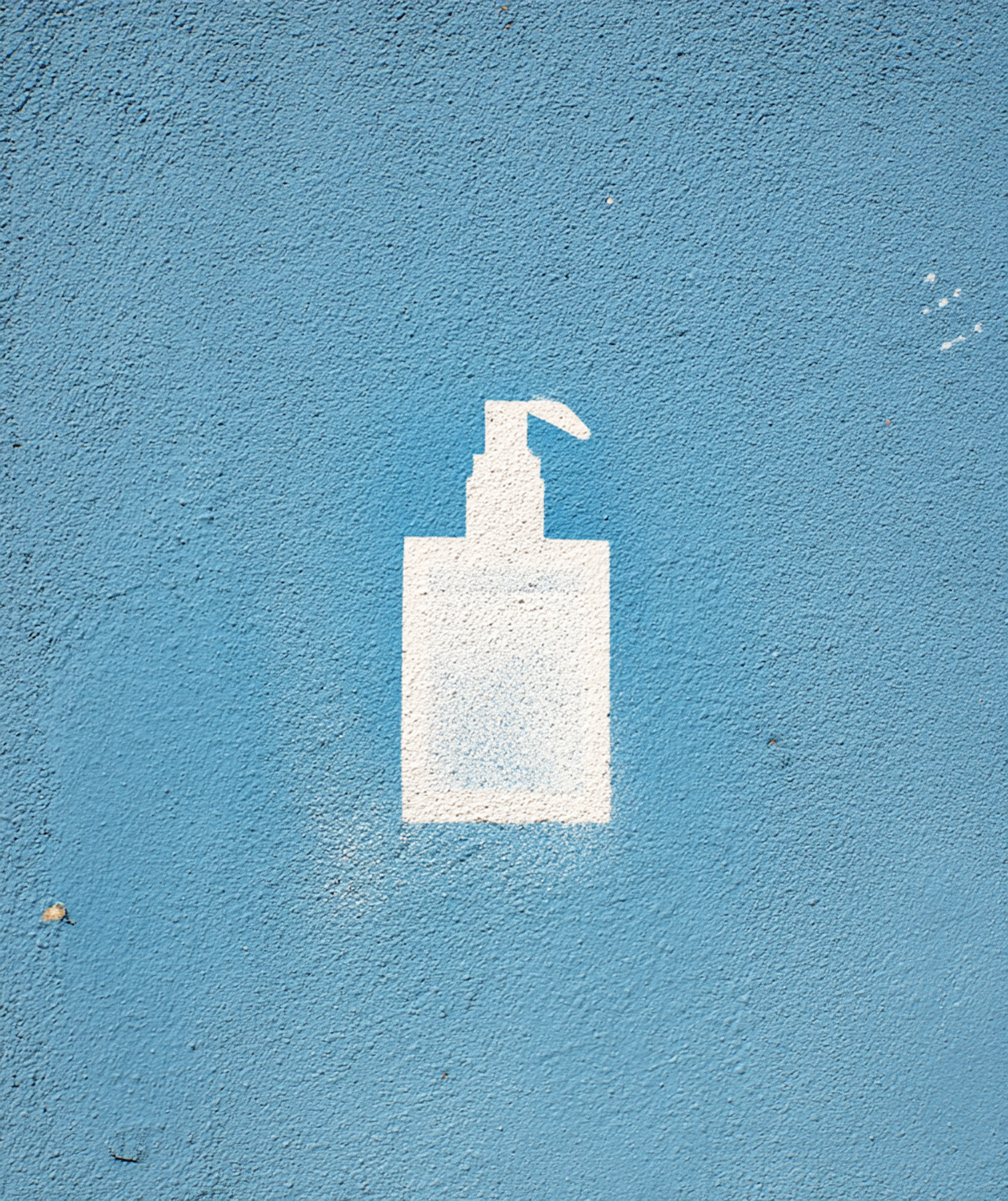 White pump bottle stencil on a textured blue wall, creating a minimalist and modern aesthetic with bold contrast.