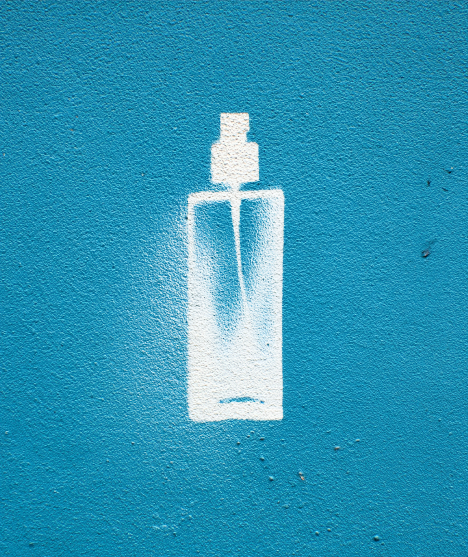 White stencil of a spray bottle on a textured blue wall, creating a minimalist and striking visual contrast.