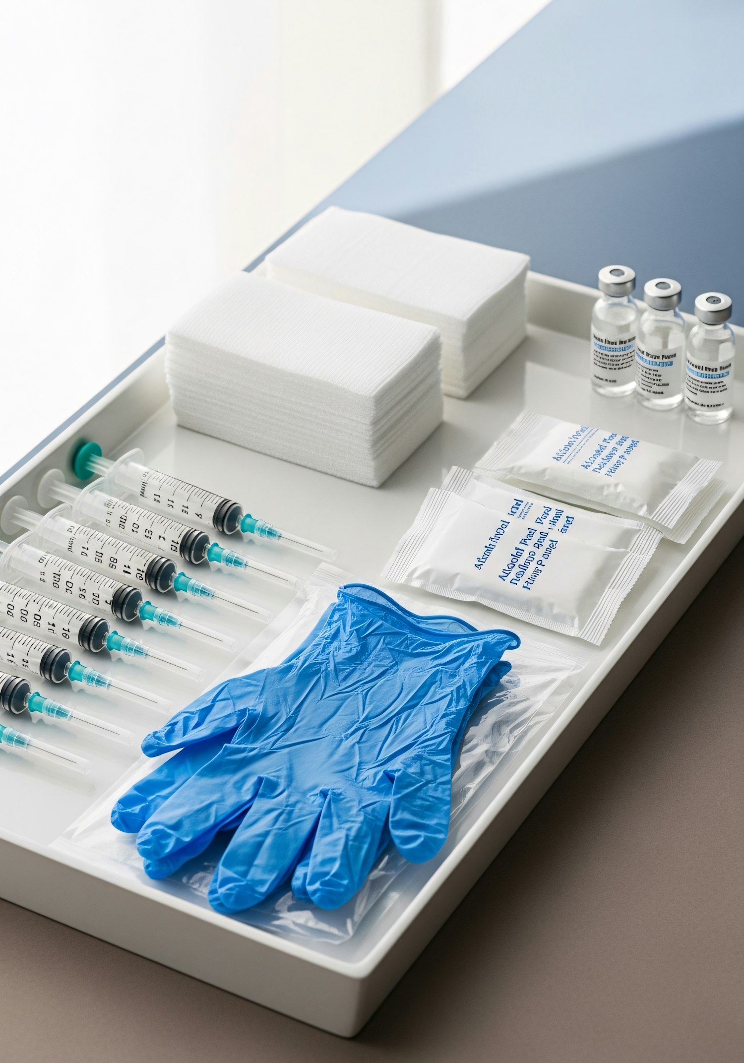 Organized medical tray with syringes, gloves, gauze pads, alcohol prep pads, and vials, perfect for clinical or healthcare settings.