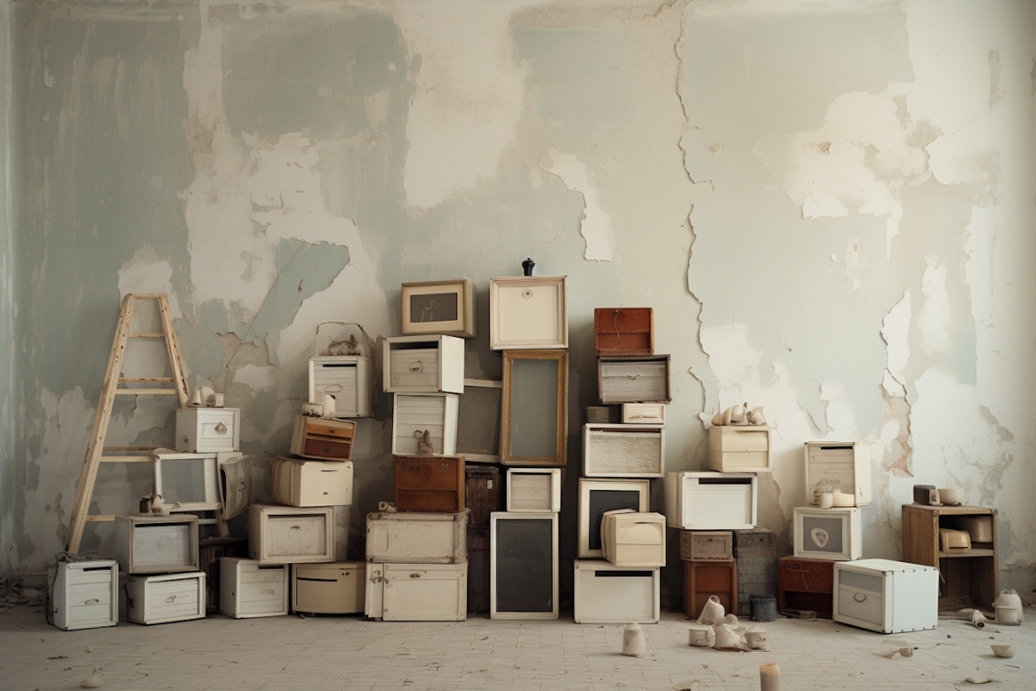 Eclectic stack of drawers and boxes against a peeling wall, with a wooden ladder and scattered objects creating an artistic, rustic vibe.