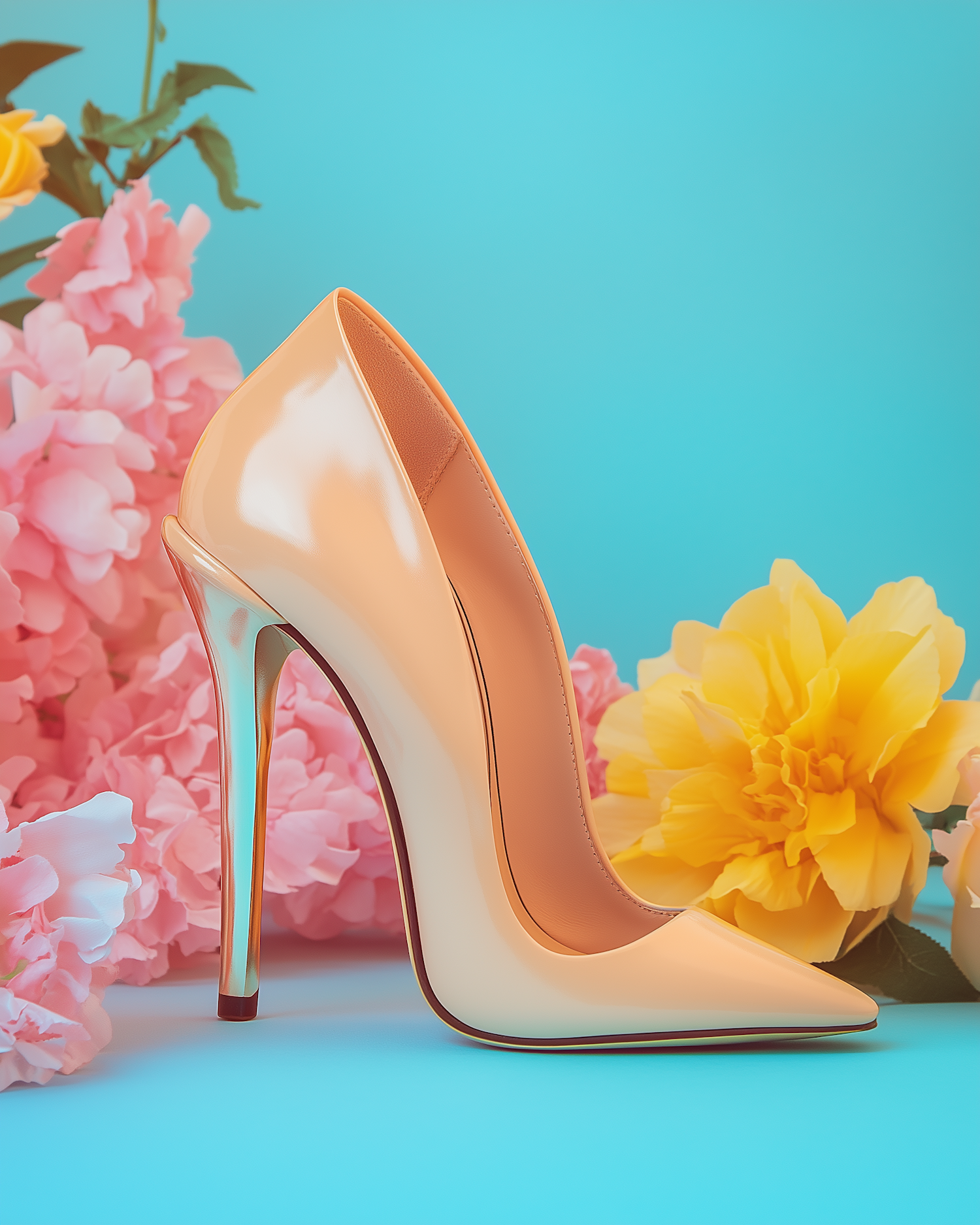 Elegant peach high heel with glossy finish, surrounded by vibrant pink and yellow flowers on a turquoise background.