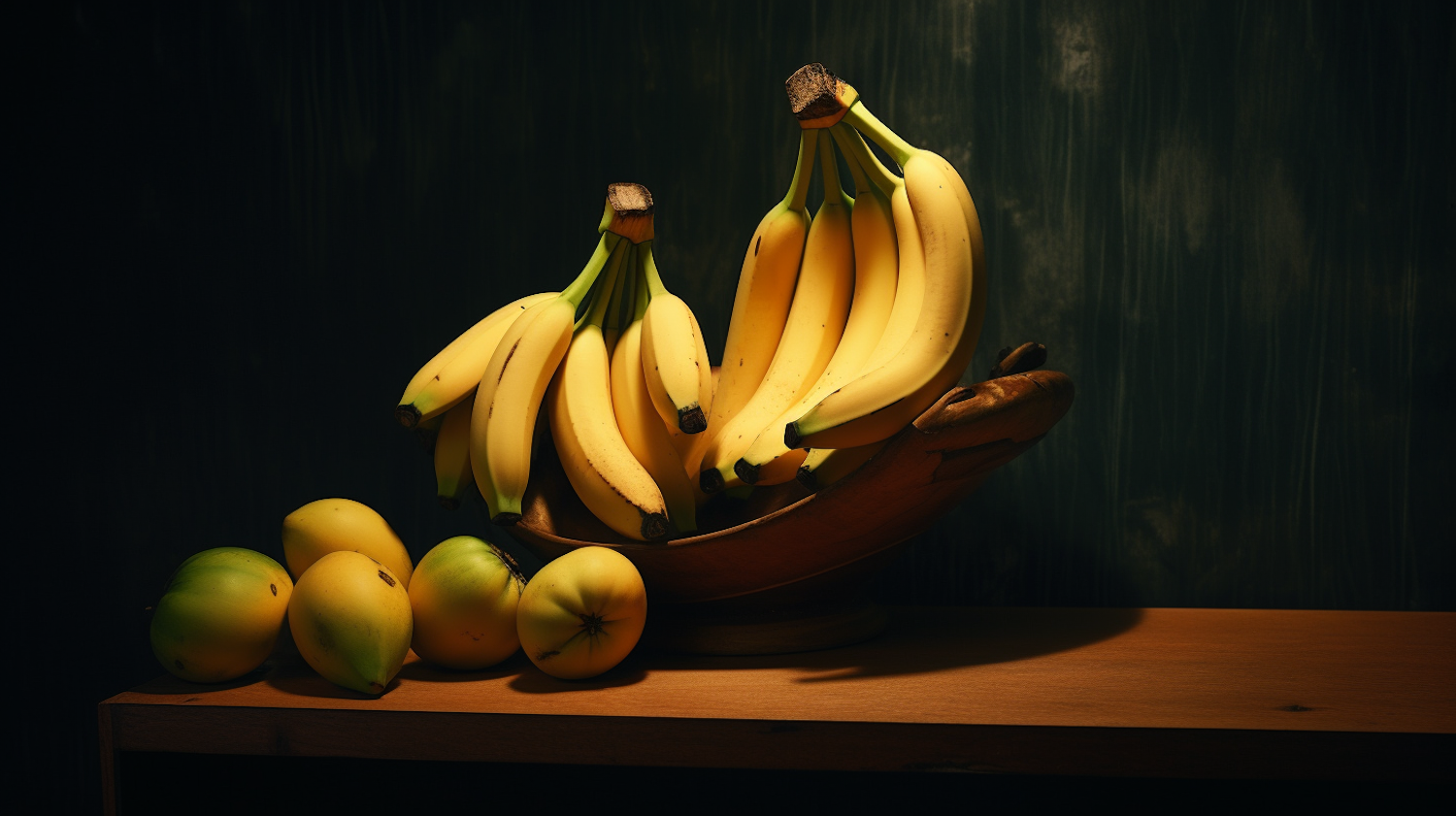 A wooden bowl of ripe bananas and mangoes on a table, set against a dark, textured background with warm, focused lighting.