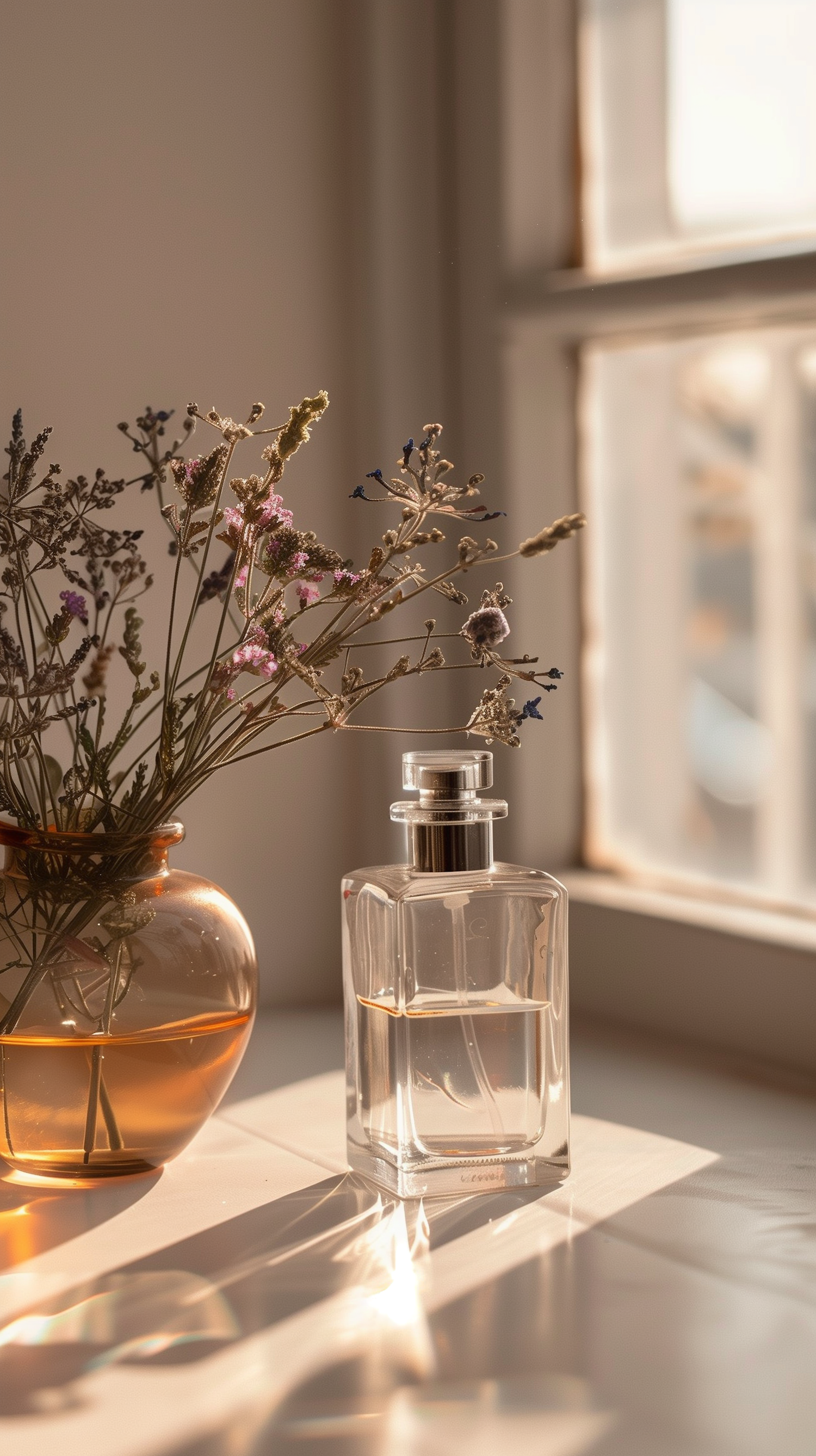 A minimalist perfume bottle and amber vase with dried flowers bathed in warm sunlight on a windowsill. Perfect cozy aesthetic.