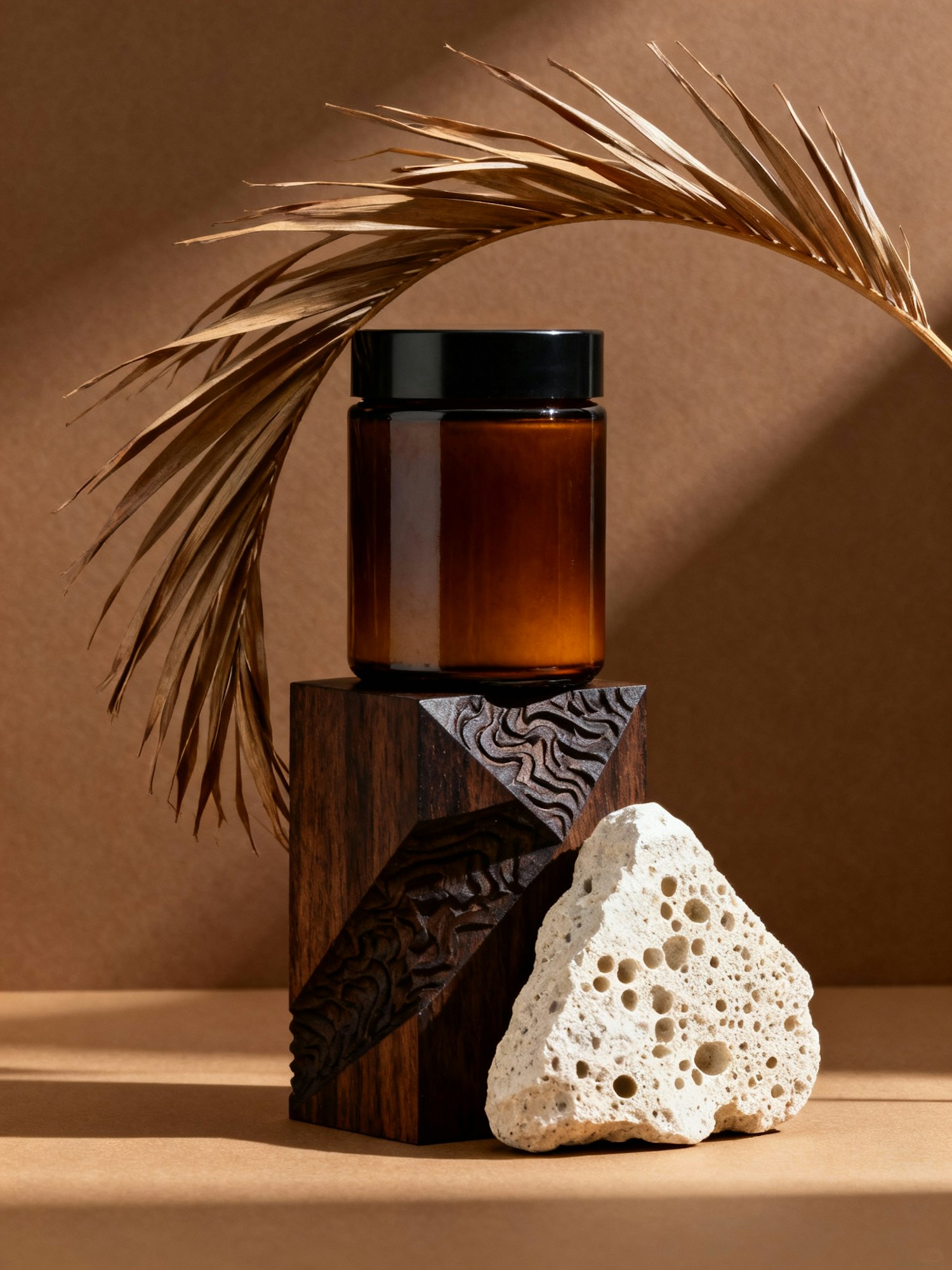 Studio product photography in a refined, sculptural, and organic art direction — matte amber glass packaging with a black lid, minimalist and label-free, placed against a warm brown studio background. The lighting is soft, directional, and diffused from one side, creating gentle shadows and a natural sense of depth. The overall atmosphere is earthy and calm, with warm tones, tactile textures, and a poetic balance between raw materials and crafted elegance. Style inspired by high-end skincare campaigns — natural sophistication, sensory minimalism, and sculptural composition. A large amber jar elevated on a geometric composition of two contrasting textures: a carved piece of dark wood and a light porous stone. A dried palm frond curves around the composition, creating a frame of natural movement around the object.
