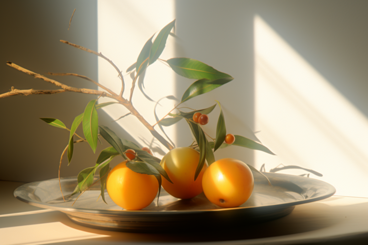 Still life with bright orange fruits and green leaves on a metallic plate, bathed in warm sunlight.