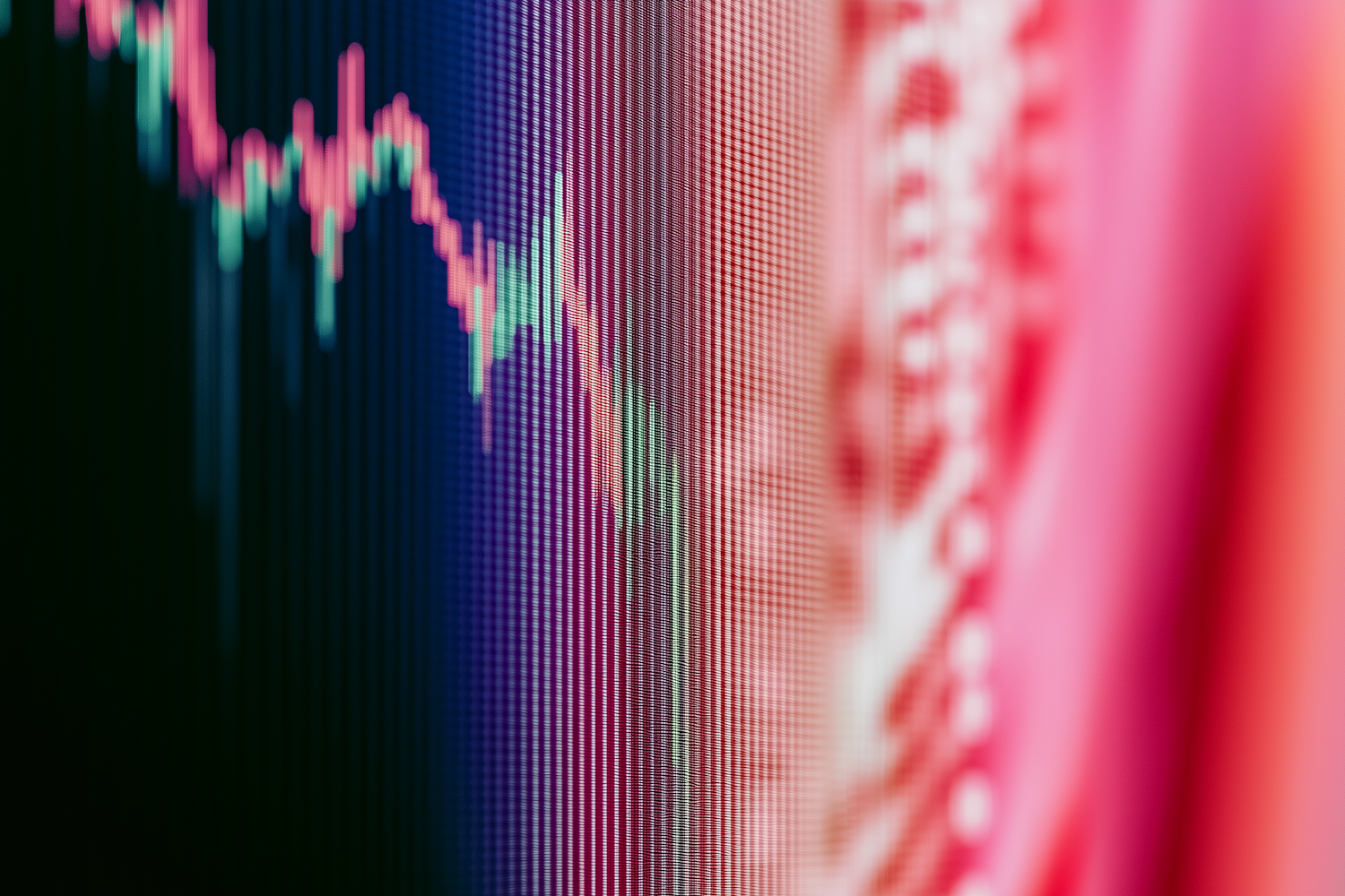 Vibrant close-up of a stock market chart with fluctuating lines and a blurred red pattern, symbolizing finance and data analysis.