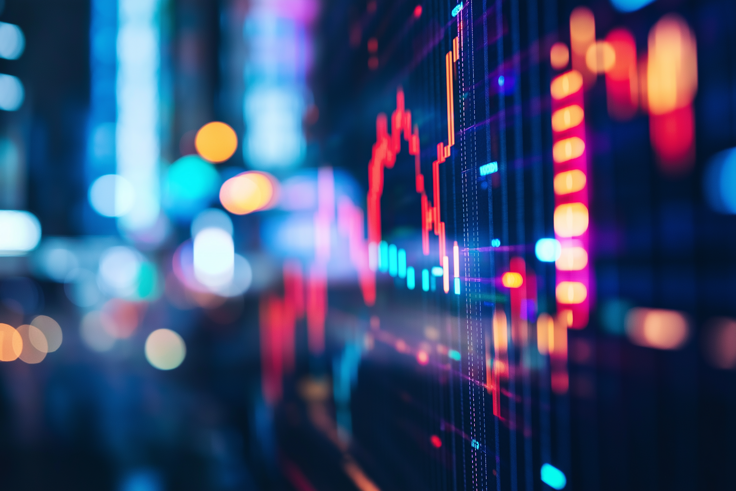Vivid stock market chart with glowing candlesticks over a blurred neon-lit cityscape, capturing a futuristic financial vibe.