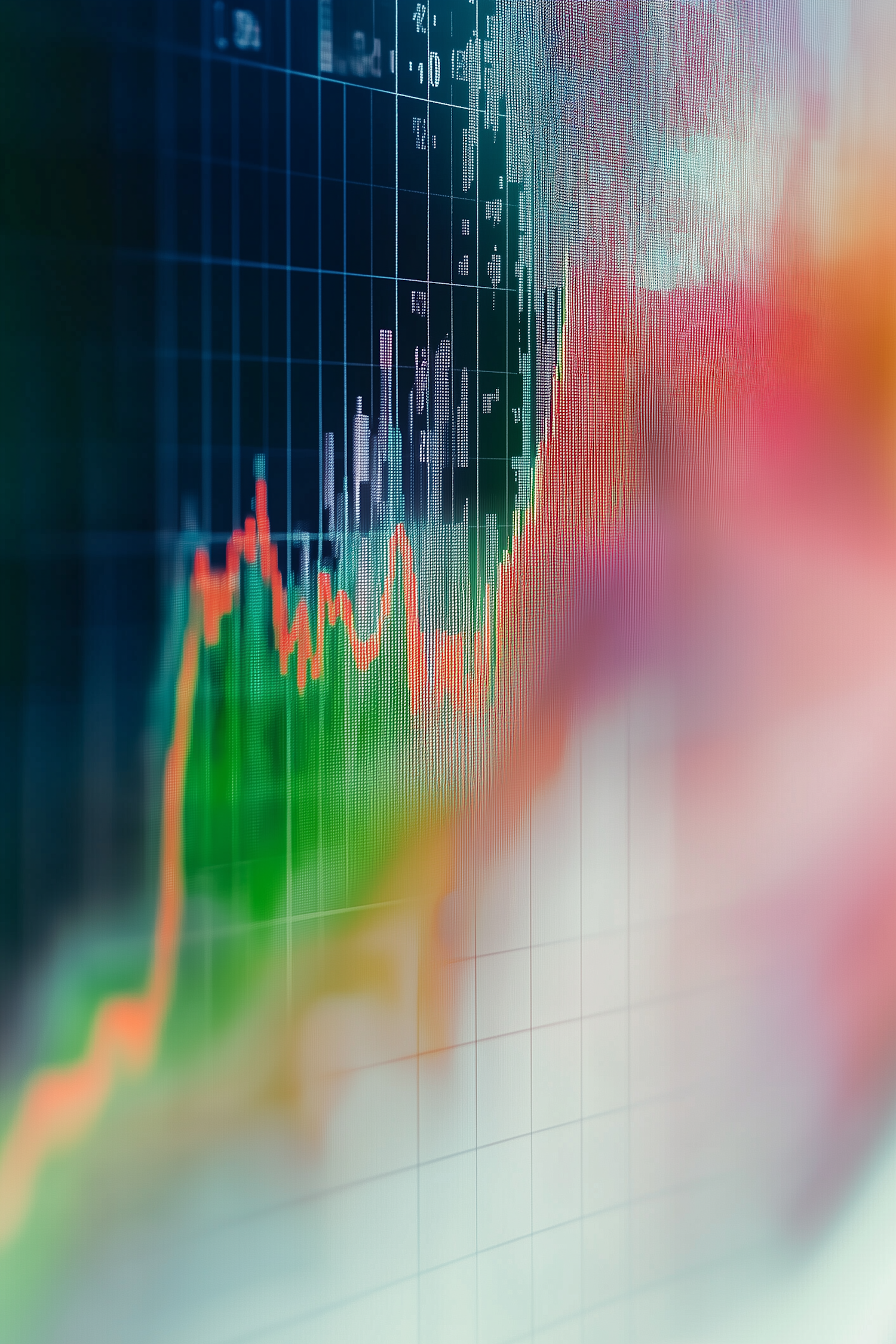 Colorful stock market chart with red and green candlesticks showing a sharp upward trend, set against a gradient background.