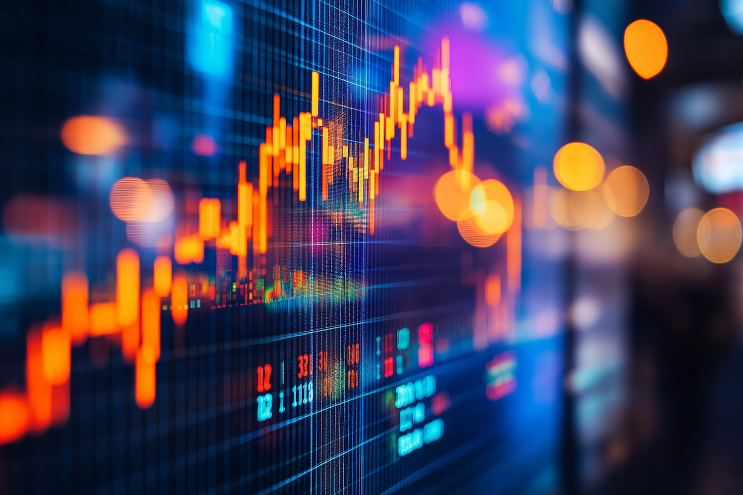 Bright stock market chart with orange candlesticks on a digital screen, set against a blue and purple background with blurred lights.