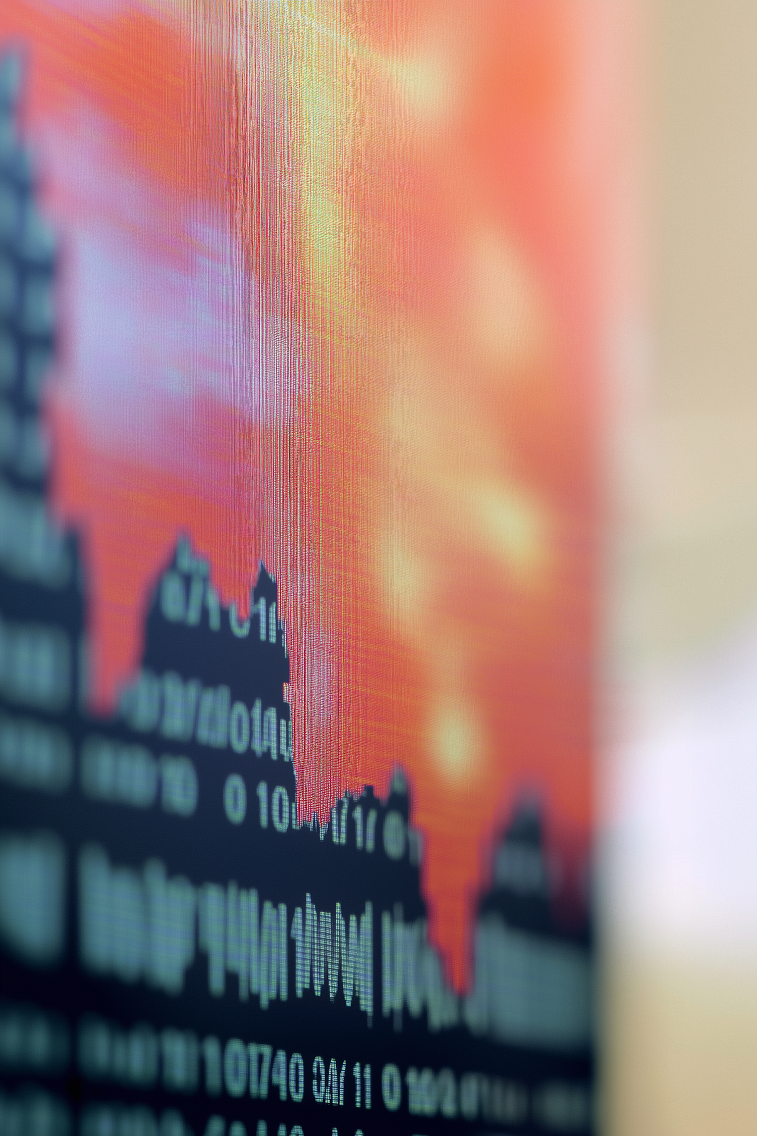 Close-up of a stock market chart with jagged peaks, numerical data, and a warm gradient background resembling a sunset.