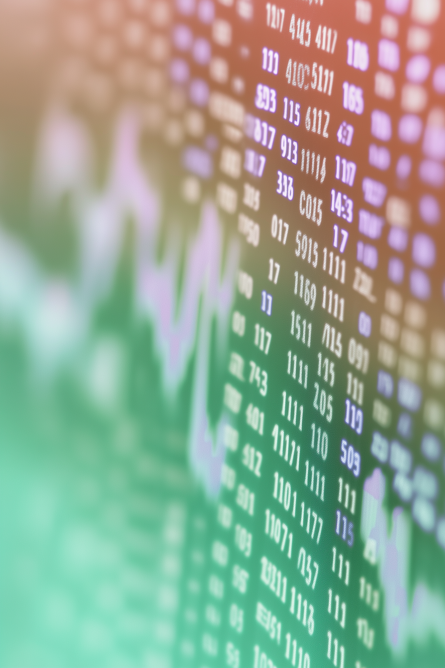 Blurred stock market display with numbers and graphs in green and orange tones, symbolizing financial data and market trends.