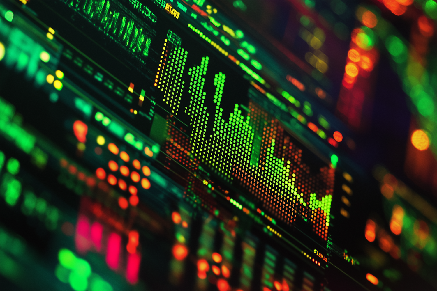 Bright stock market display with glowing green, red, and yellow graphs, showcasing financial trends and analytics in a futuristic style.
