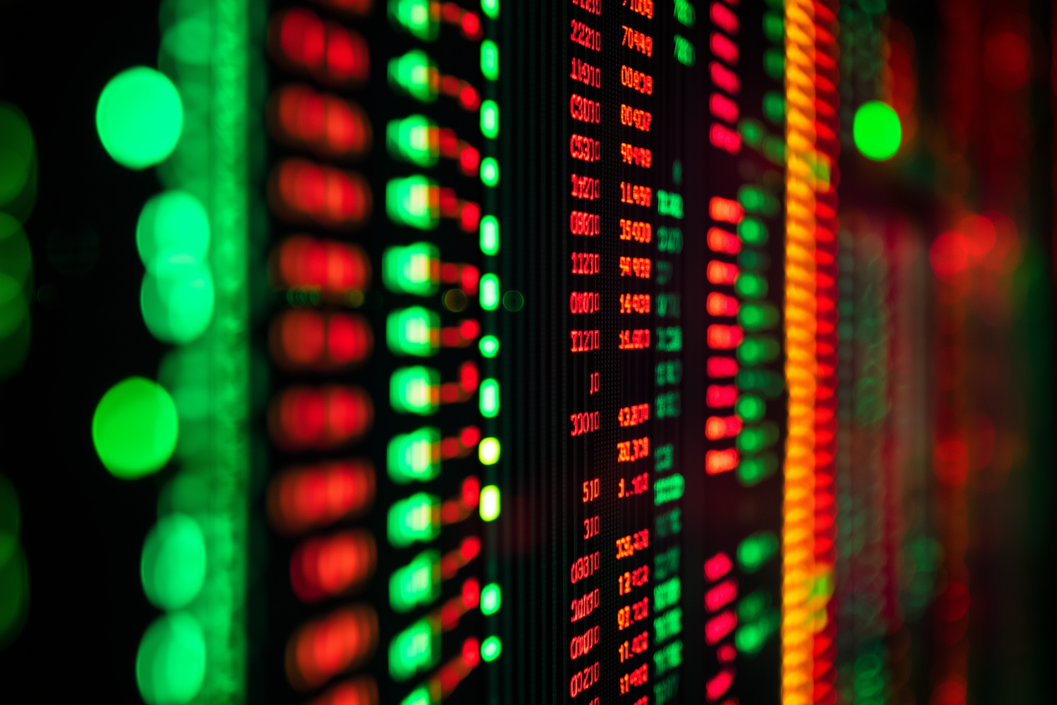 Blurred stock market data screen with glowing red and green numbers, symbolizing market trends and financial activity.