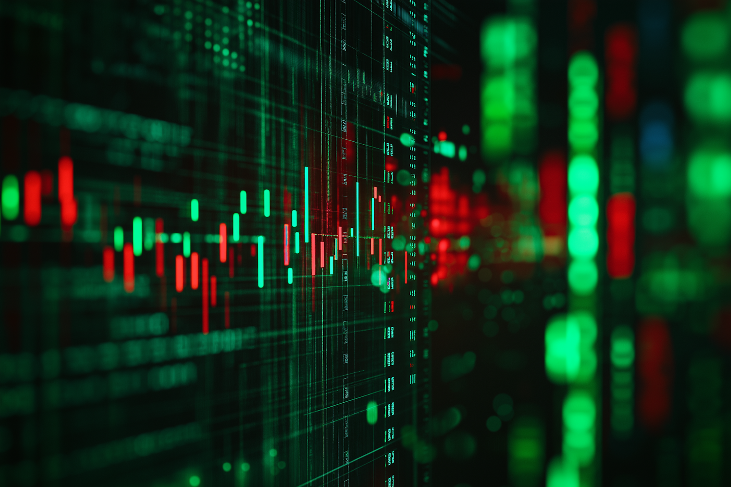 Vibrant stock market interface with green and red candlestick charts, glowing data, and a dynamic trading atmosphere.