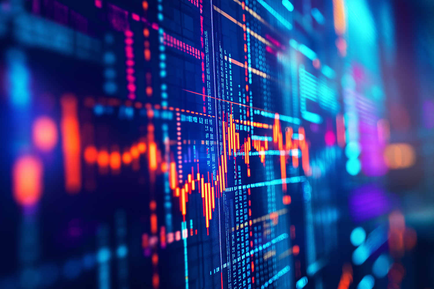 Bright digital stock market display with glowing blue, orange, and pink graphs, candlestick patterns, and trading data on a dark background.