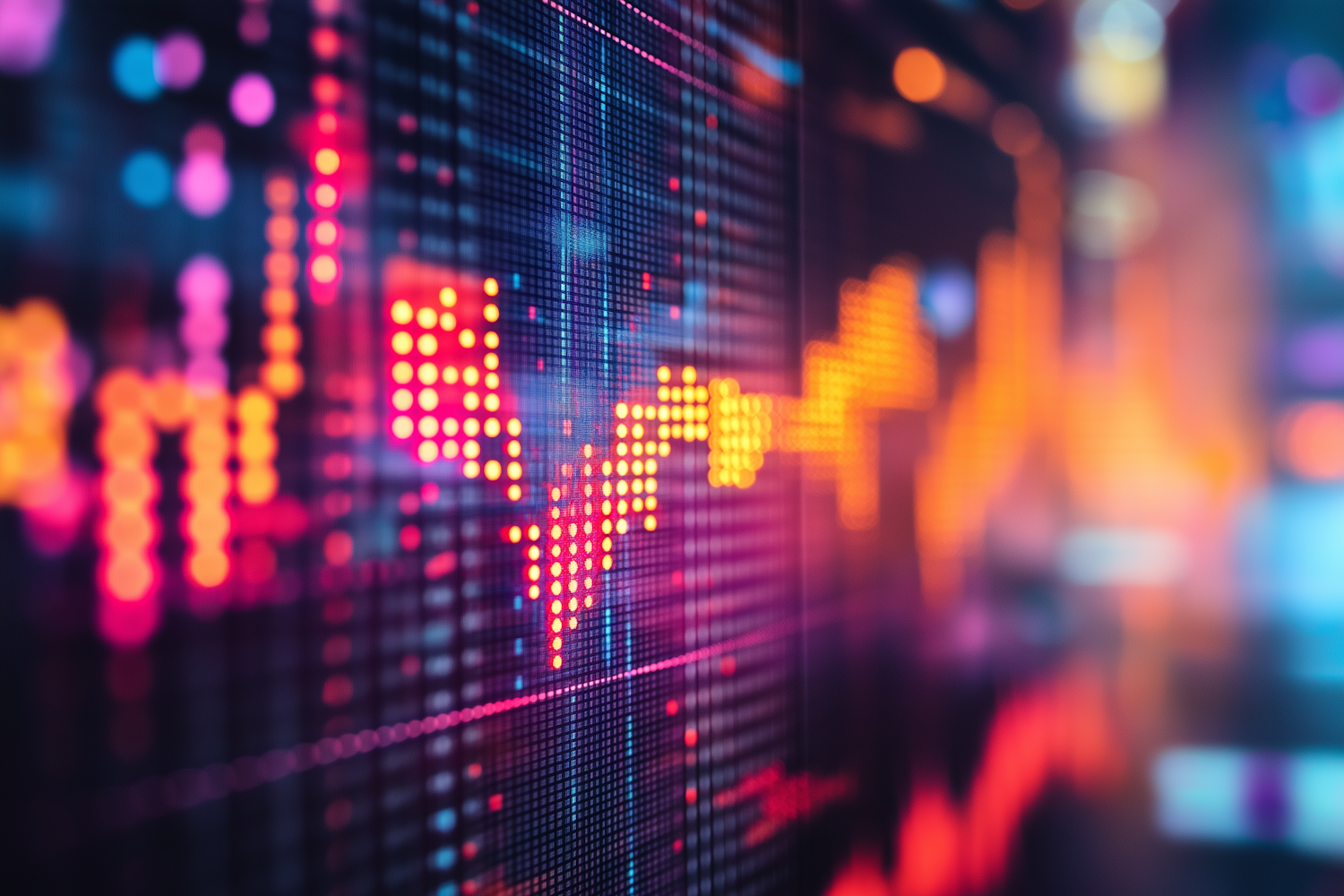 Bright stock market data visualization with glowing orange trend lines and a futuristic, high-tech ambiance.