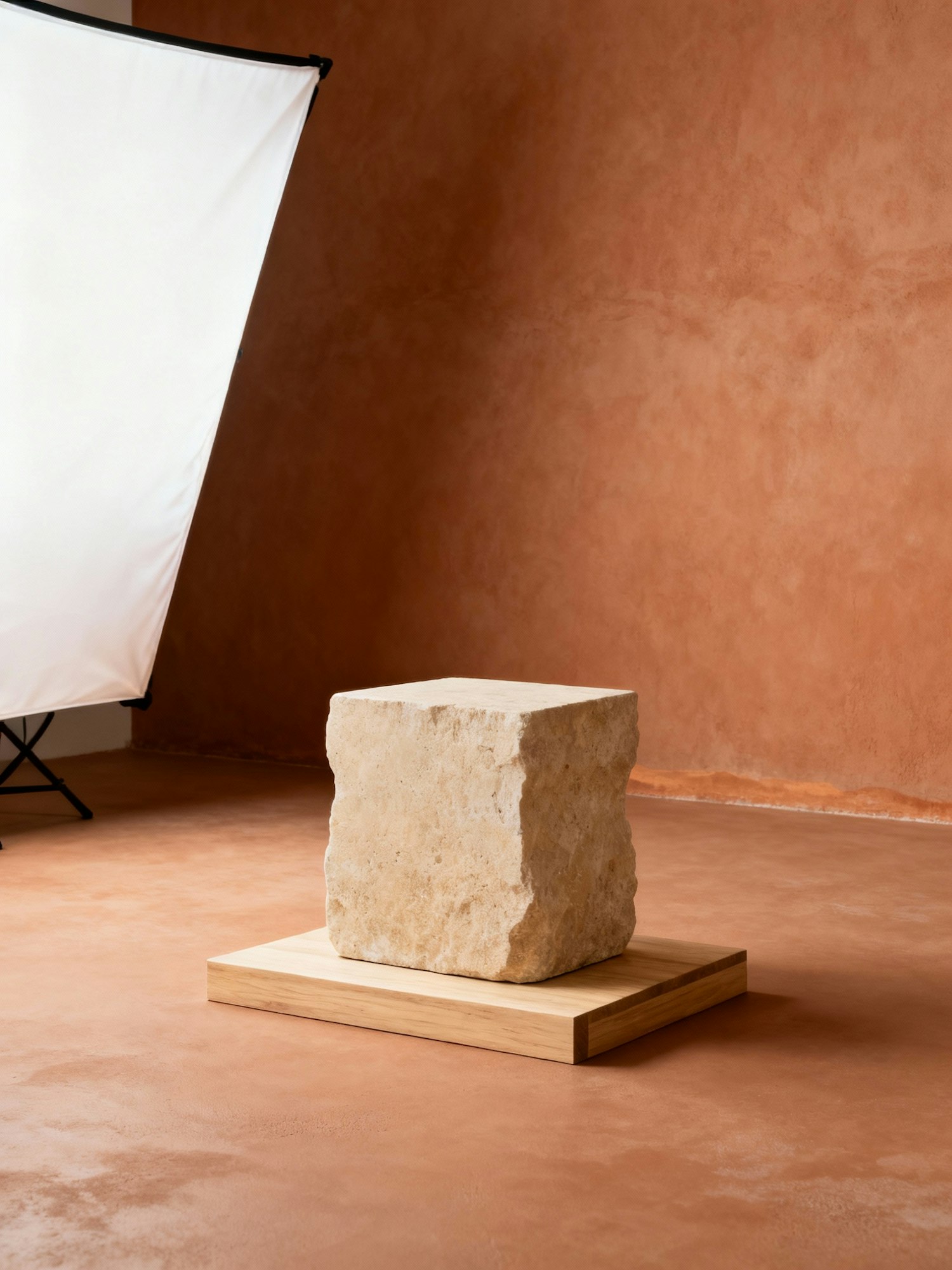 A stone block on a wooden base in a studio with terracotta walls and a light diffuser, showcasing natural textures and warm tones.