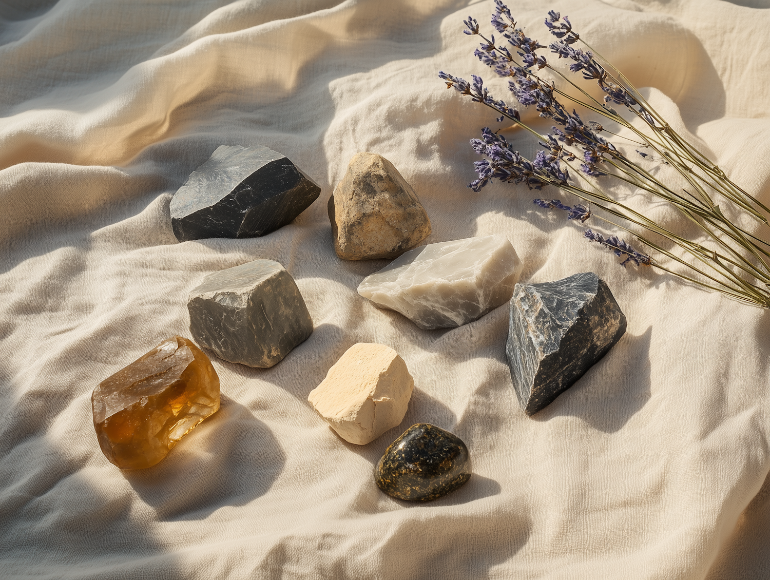 A serene arrangement of diverse stones on cream fabric, accented by dried lavender and soft sunlight, creating a natural, earthy scene.