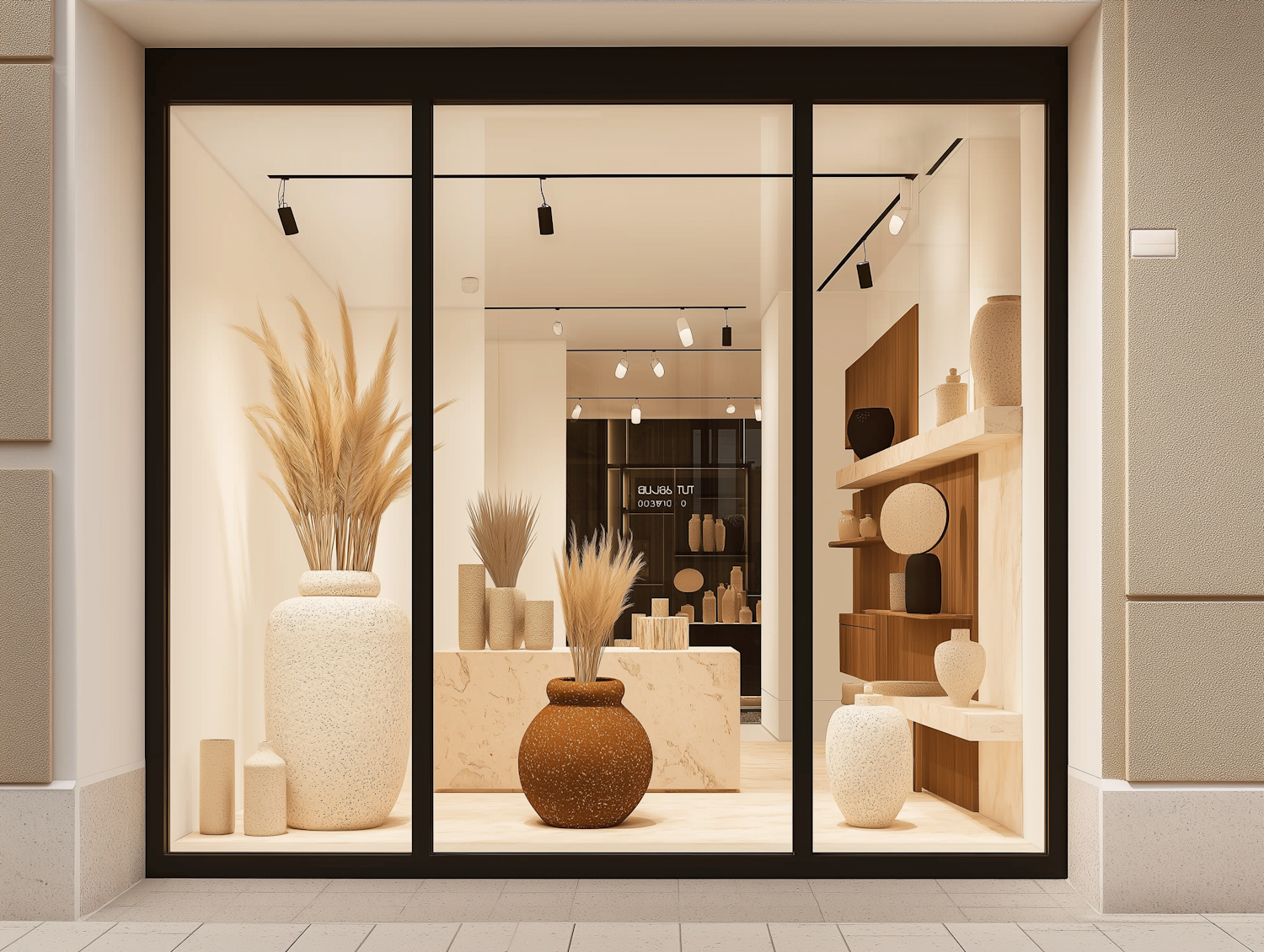 Elegant storefront with vases and pampas grass in warm earthy tones. Stylish display with textured ceramics and soft lighting.