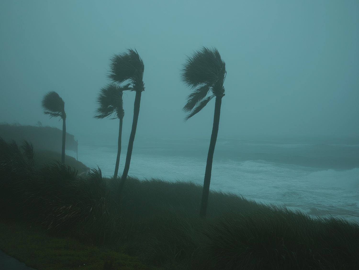 Palm trees bend in strong winds during a stormy coastal scene, with dark teal skies and crashing waves creating a dramatic atmosphere.