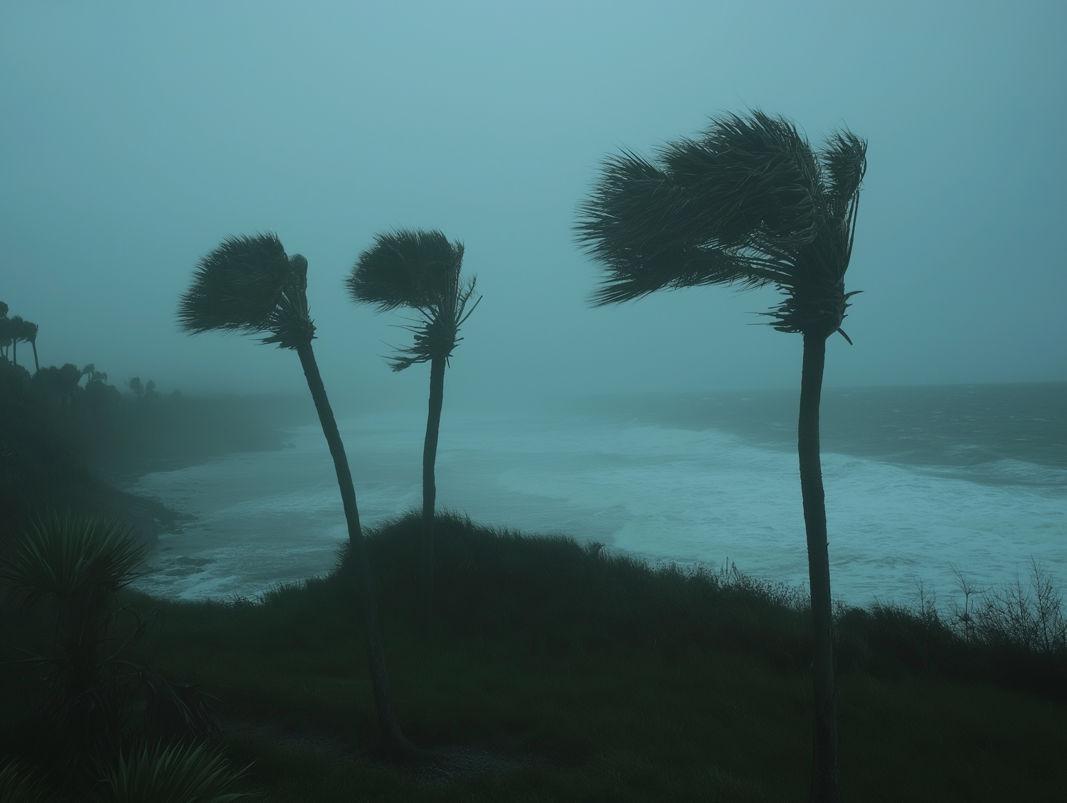 Palm trees bend in strong winds by a stormy sea, with waves crashing under a moody, overcast sky.