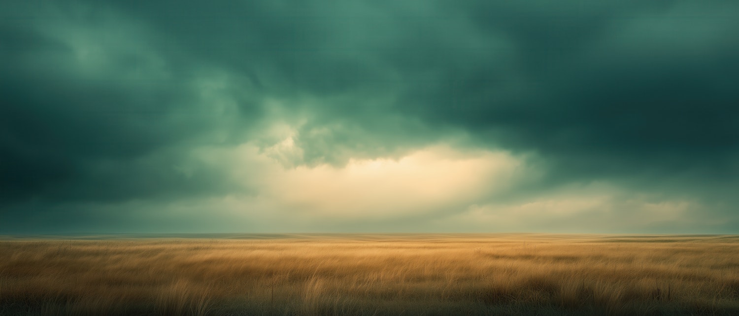 Golden grasslands under dramatic storm clouds with a break of light illuminating the horizon. A serene yet intense natural landscape.