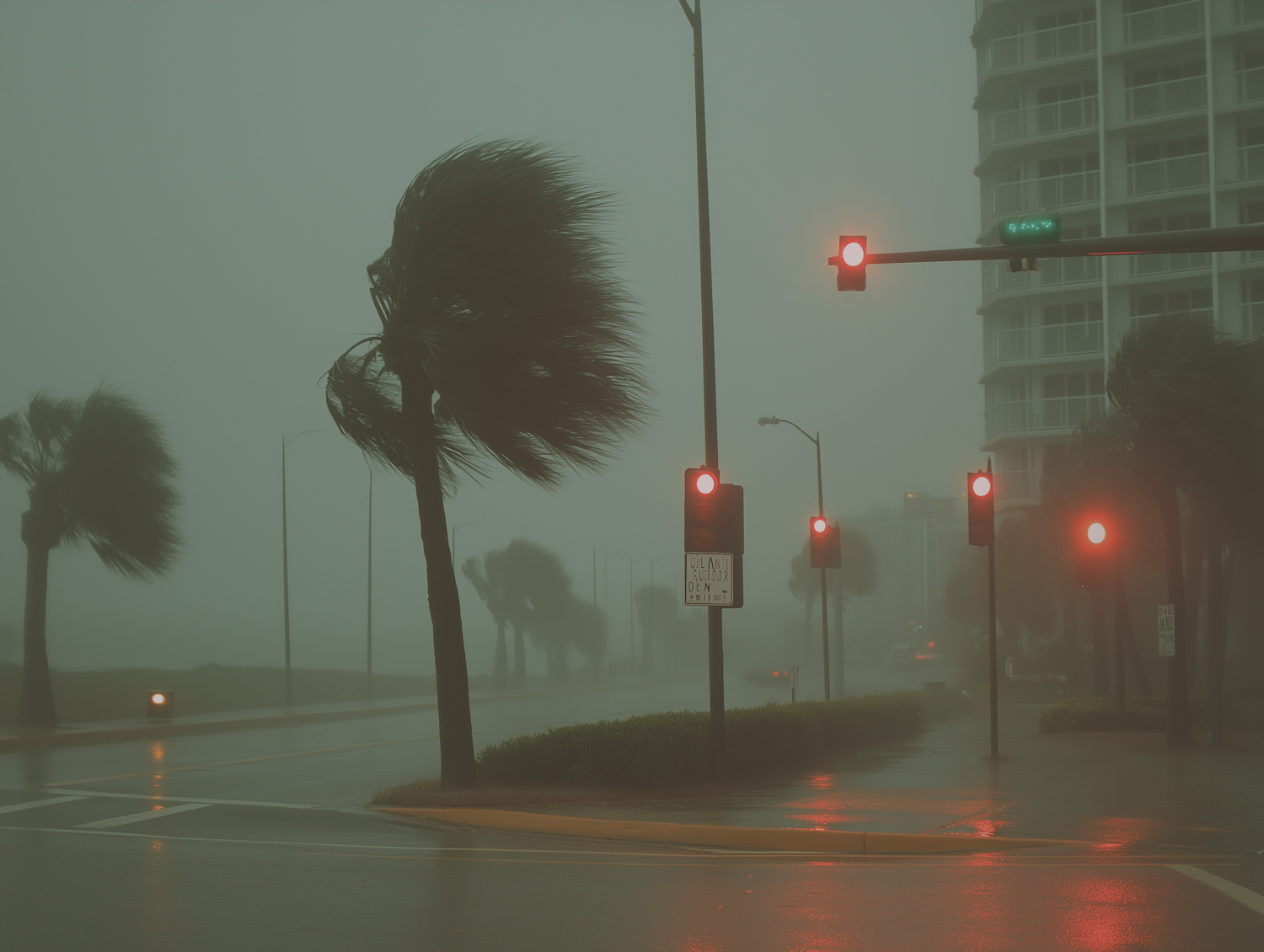 Stormy city street with bending palm trees, red traffic lights, and a misty atmosphere. Eerie and tense urban scene.