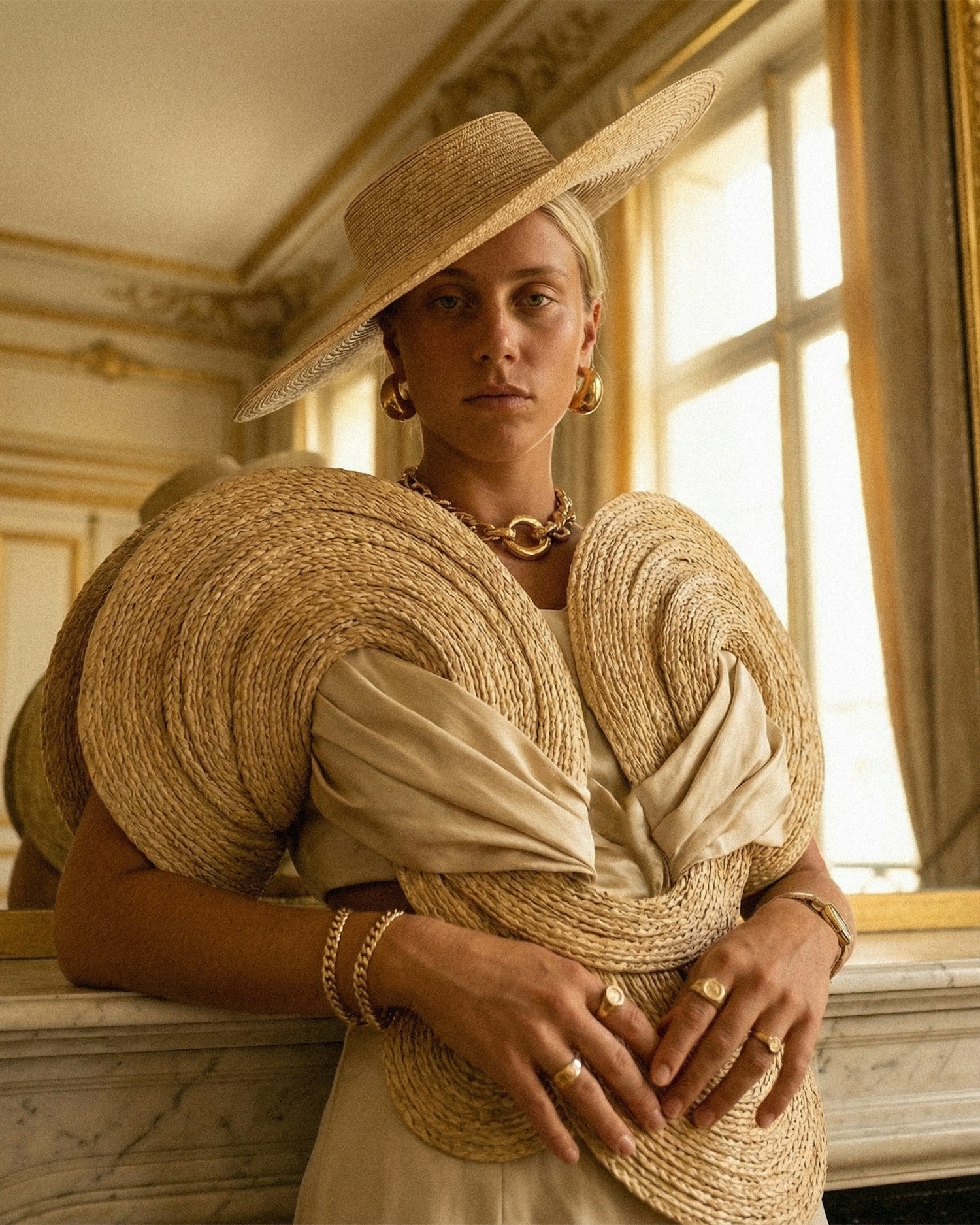 A stylish individual in a woven straw outfit and hat, accessorized with gold jewelry, poses in an elegant, light-filled interior.