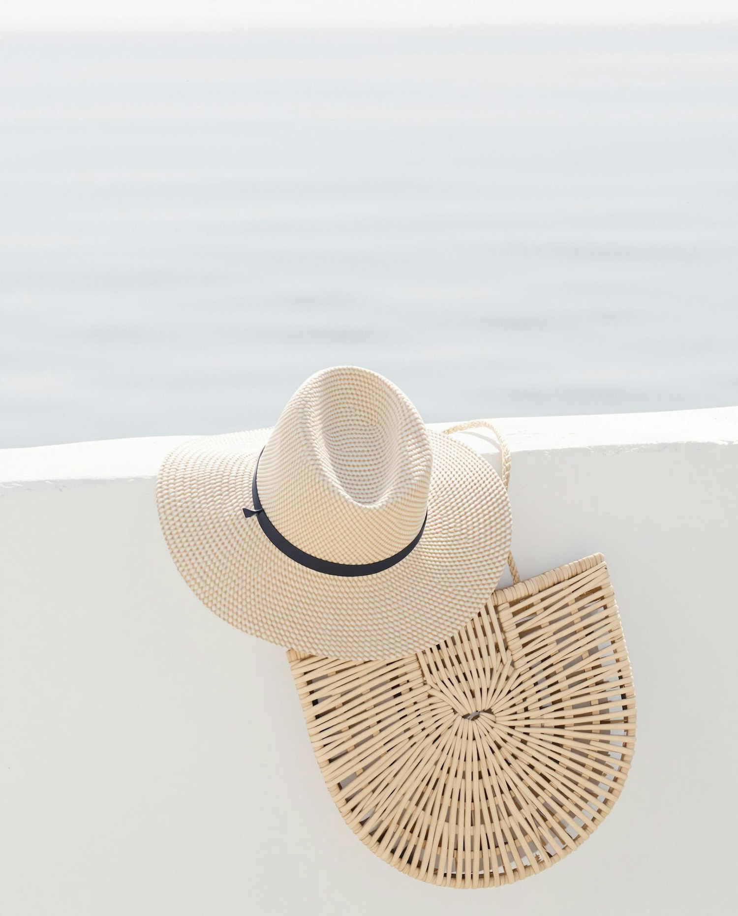 Minimal shot of a sunhat and rattan clutch bag resting on a white wall, with the ocean blurred in the background