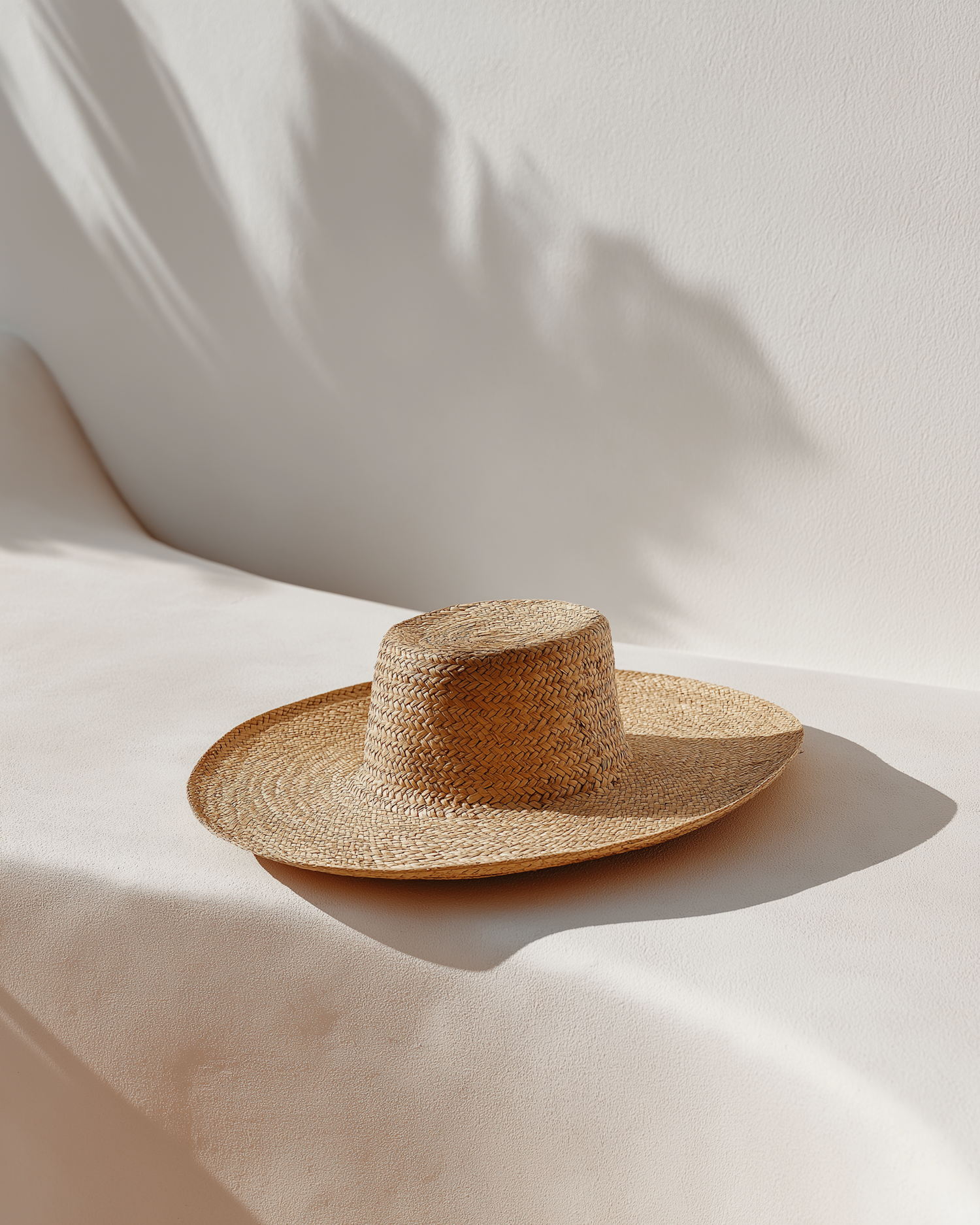 A stylish straw hat with a wide brim sits on a light surface, with soft shadows and natural lighting creating a serene atmosphere.