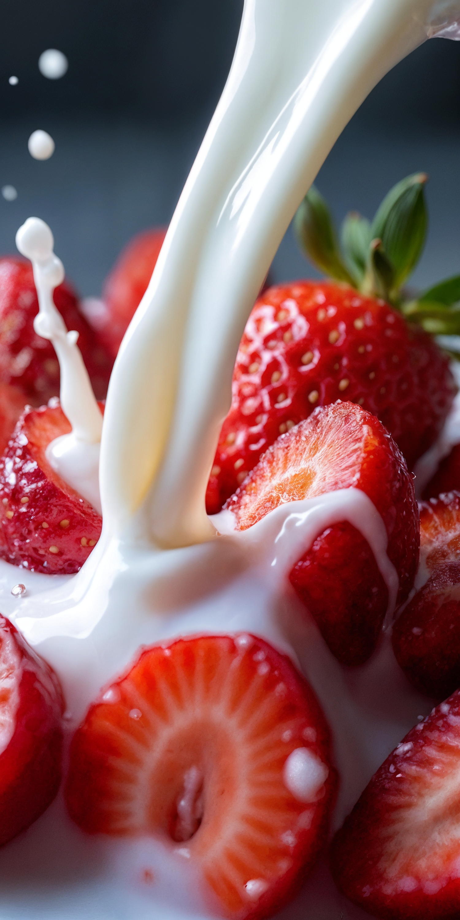 Close-up of fresh strawberries with milk pouring over them, highlighting vibrant colors and dynamic splashes for a refreshing visual.