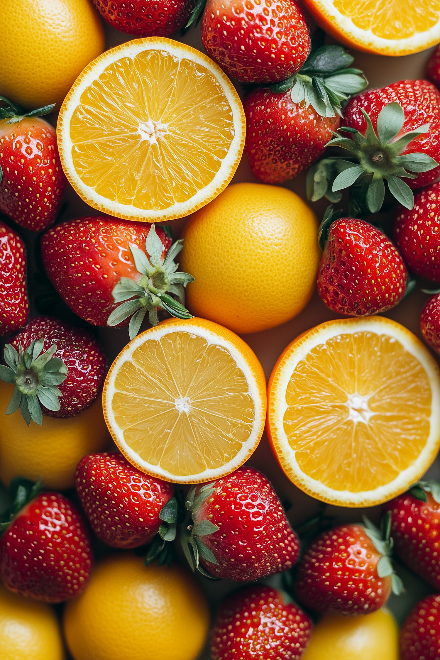 Bright strawberries and juicy orange halves create a colorful, fresh fruit arrangement perfect for a vibrant and healthy vibe.