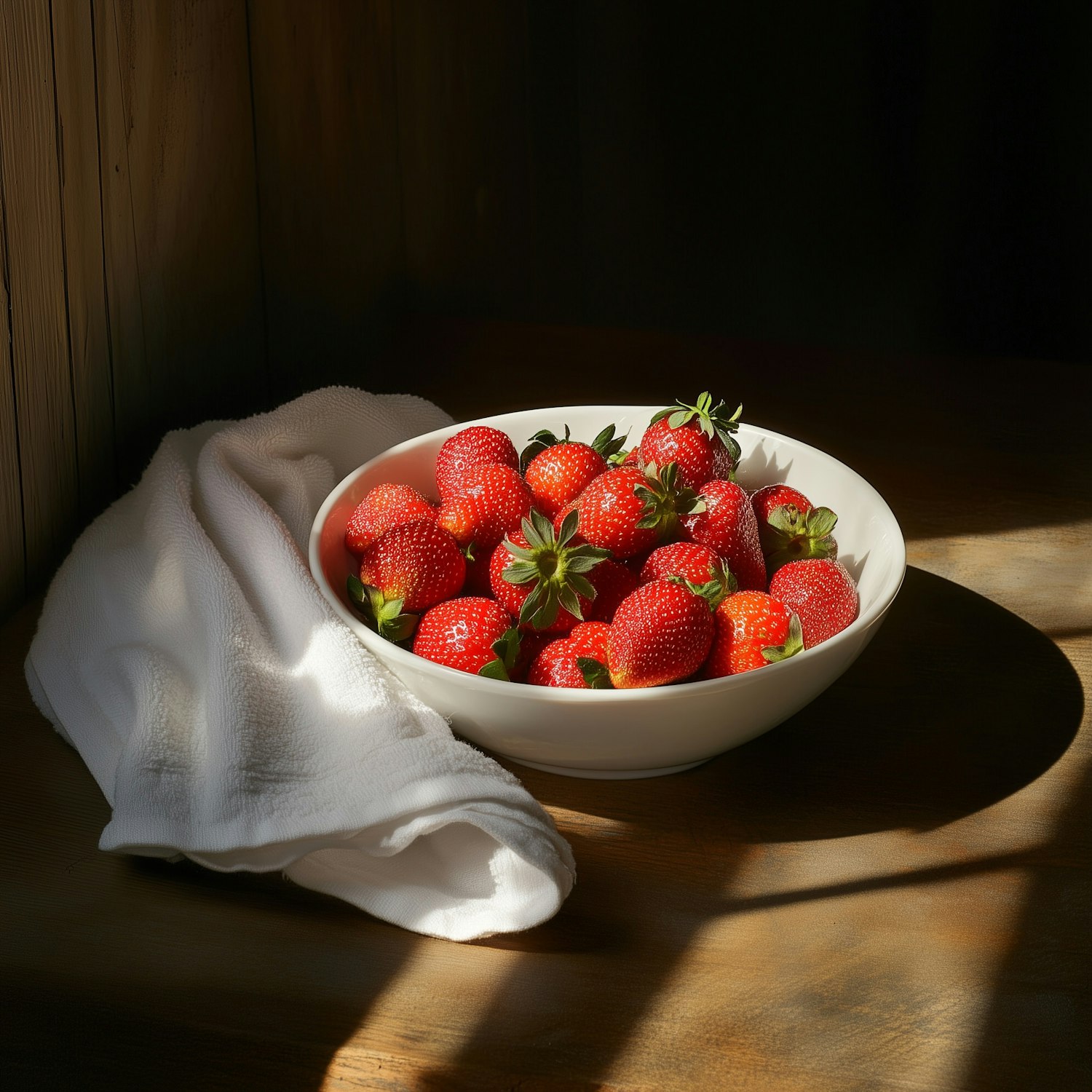 A bowl of fresh, vibrant red strawberries on a wooden table with sunlight streaming in, paired with a soft white cloth for a rustic touch.