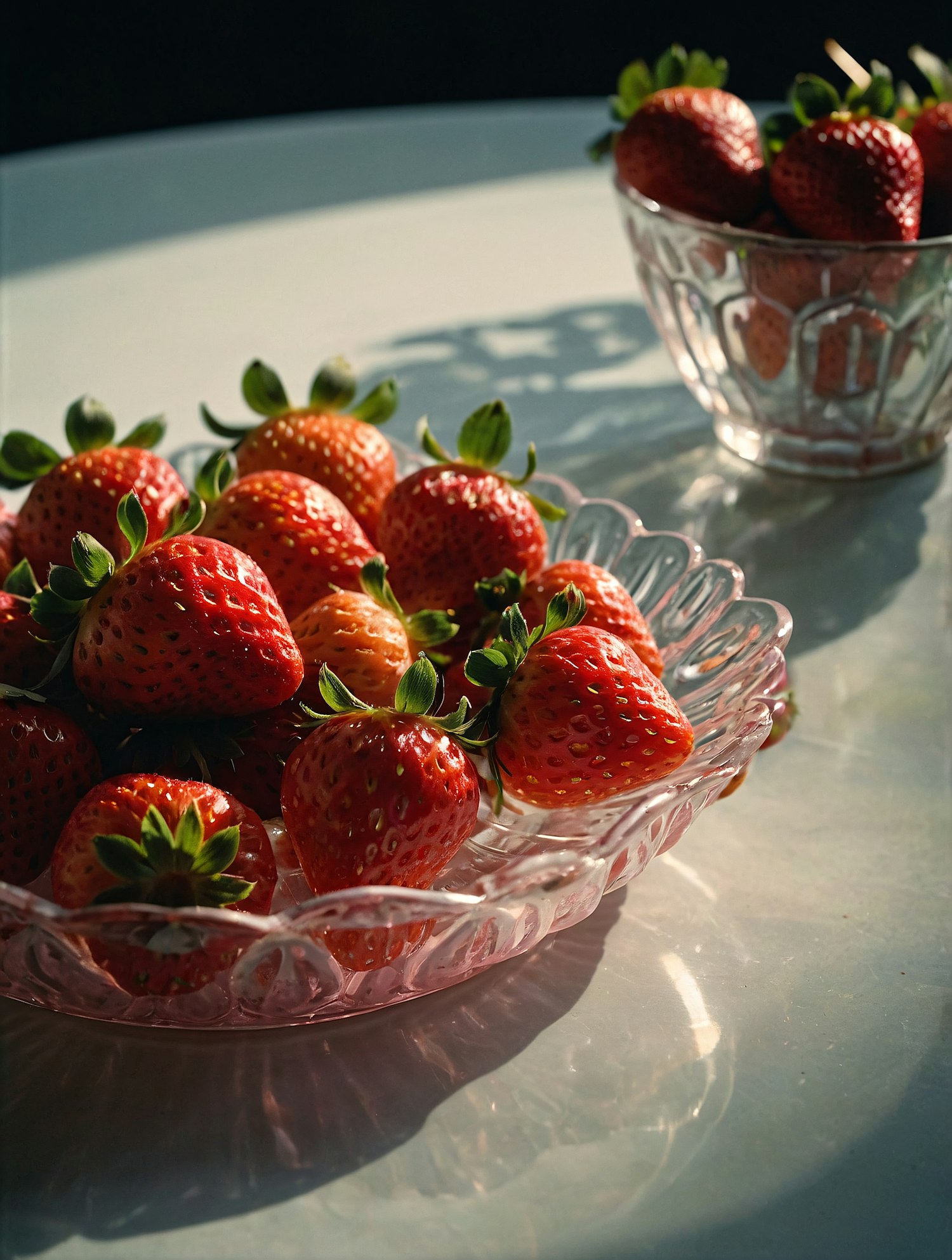 Vibrant strawberries in decorative glass bowls on a white surface, bathed in soft natural light, creating a fresh and elegant scene.