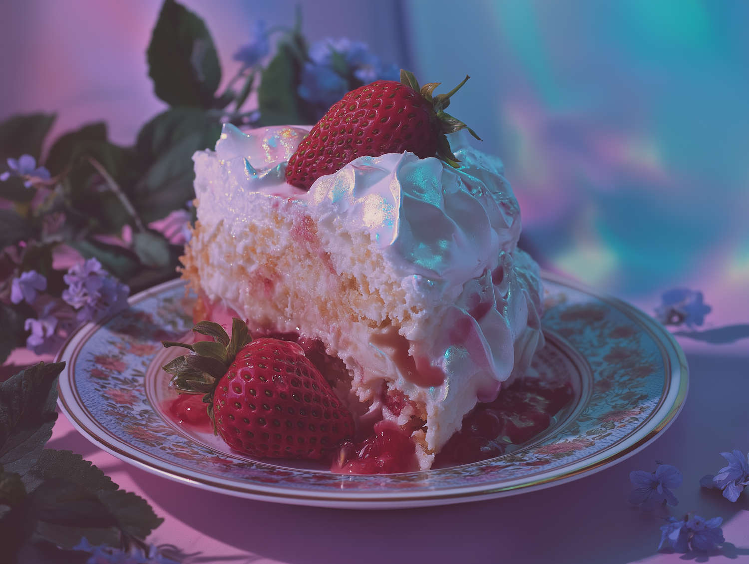 A luscious slice of strawberry plated cake with whipped topping served on a floral plate, surrounded by soft pastel lighting and decor.