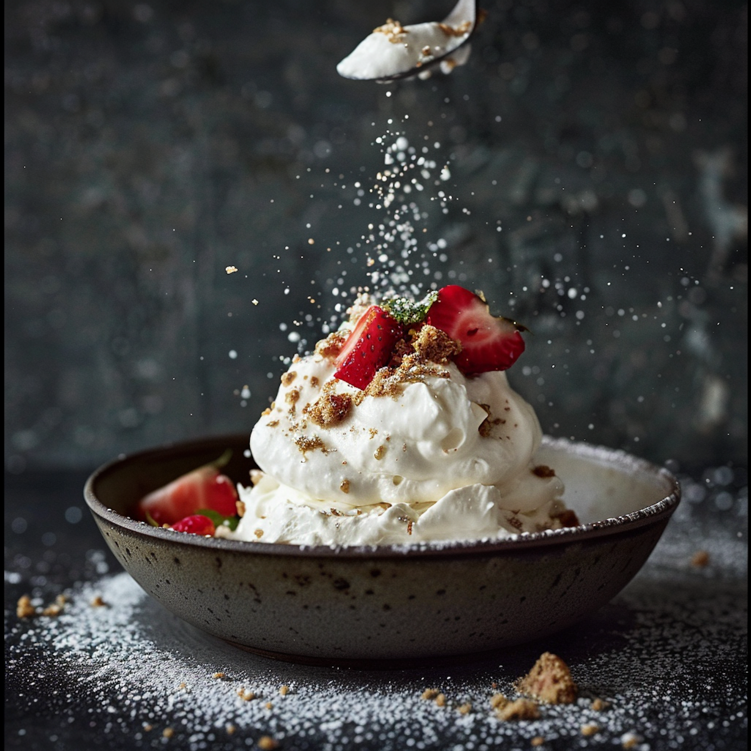 Whipped cream dessert with strawberries and cookie crumbles, dusted with powdered sugar in a rustic bowl. Elegant and appetizing.