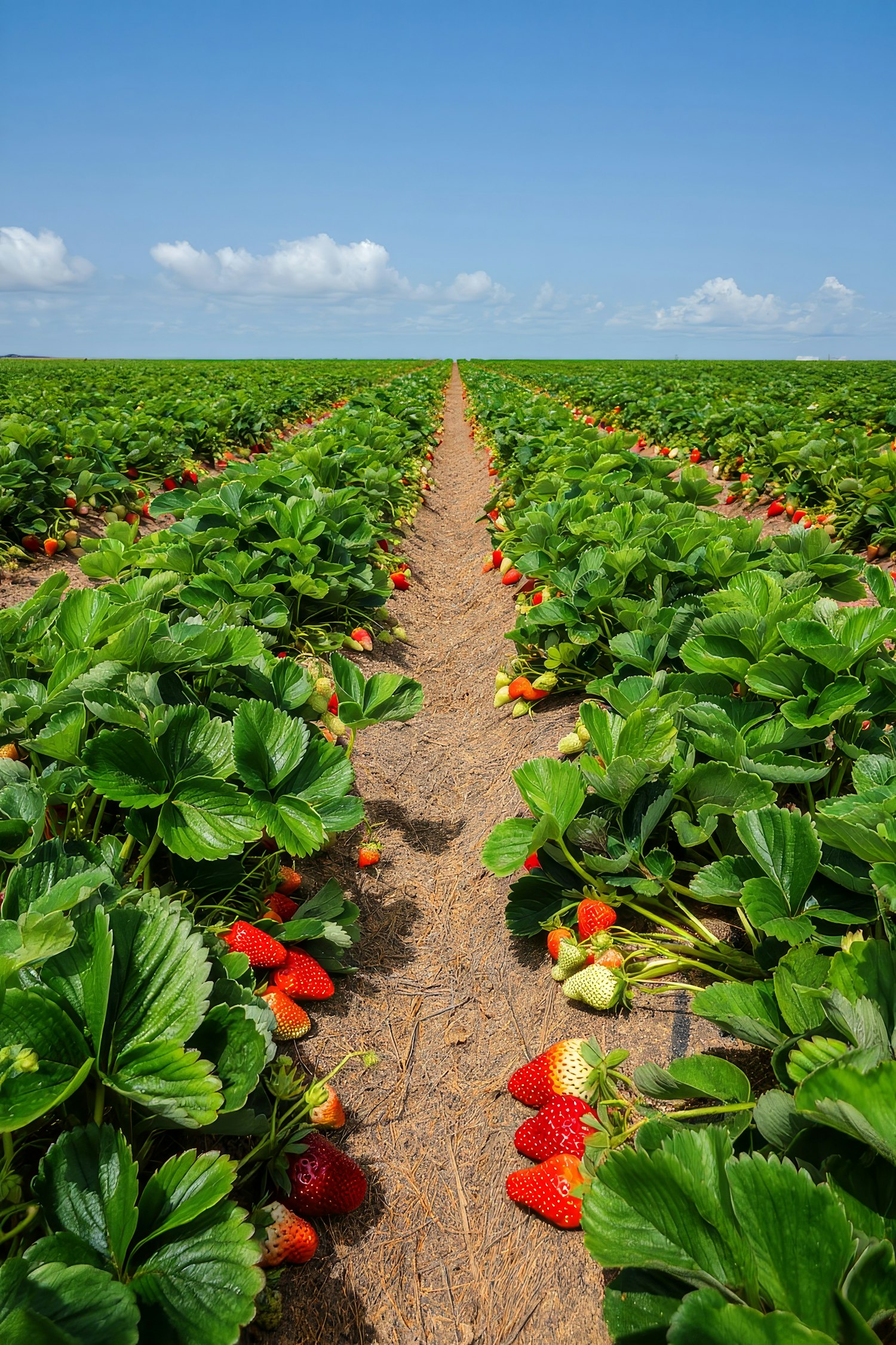 Lush strawberry fields under a clear blue sky, with ripe red strawberries and green leaves creating a vibrant, fresh scene.